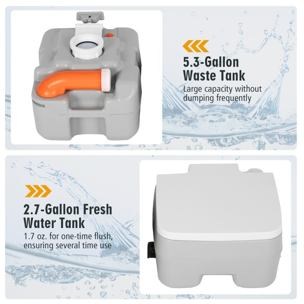 Separated & Large Capacity Tanks: Equipped with a 10L fresh water tank and a 20L waste tank, this toilet features the larger capacity than most camping toilets, leaving you free from the trouble of frequently refilling the fresh water or dumping the waste. Besides, the separated tanks also provide you with a cleaner and more hygienic using condition, preventing odors leakage.