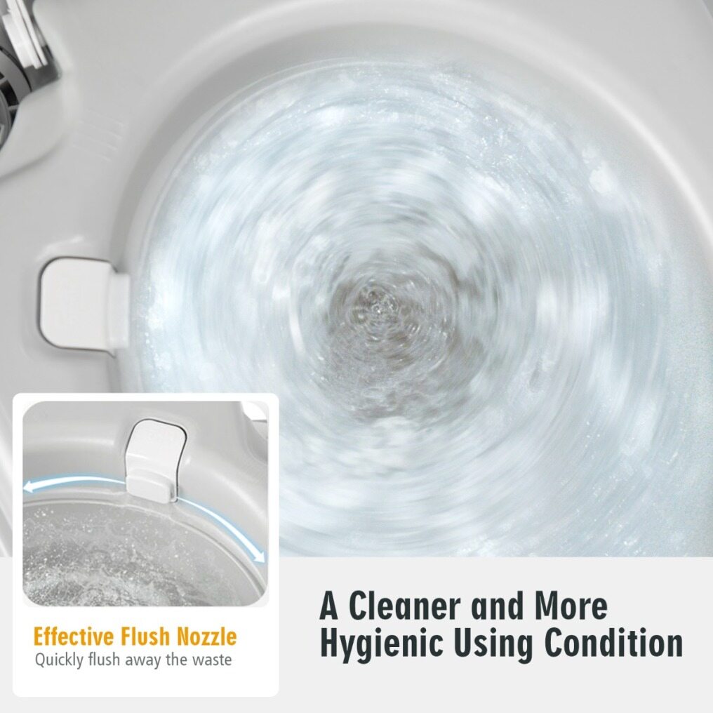 Easy to Rinse & Dump: Just pull up and press the flush pump, then the effective spout will quickly flush away the waste and leave a clean toilet for the next use. The toilet is equipped with a water level indicator. When it turns red, it means the waste tank is almost full and should be emptied. Just rotate out the waste spout and dump the waste.