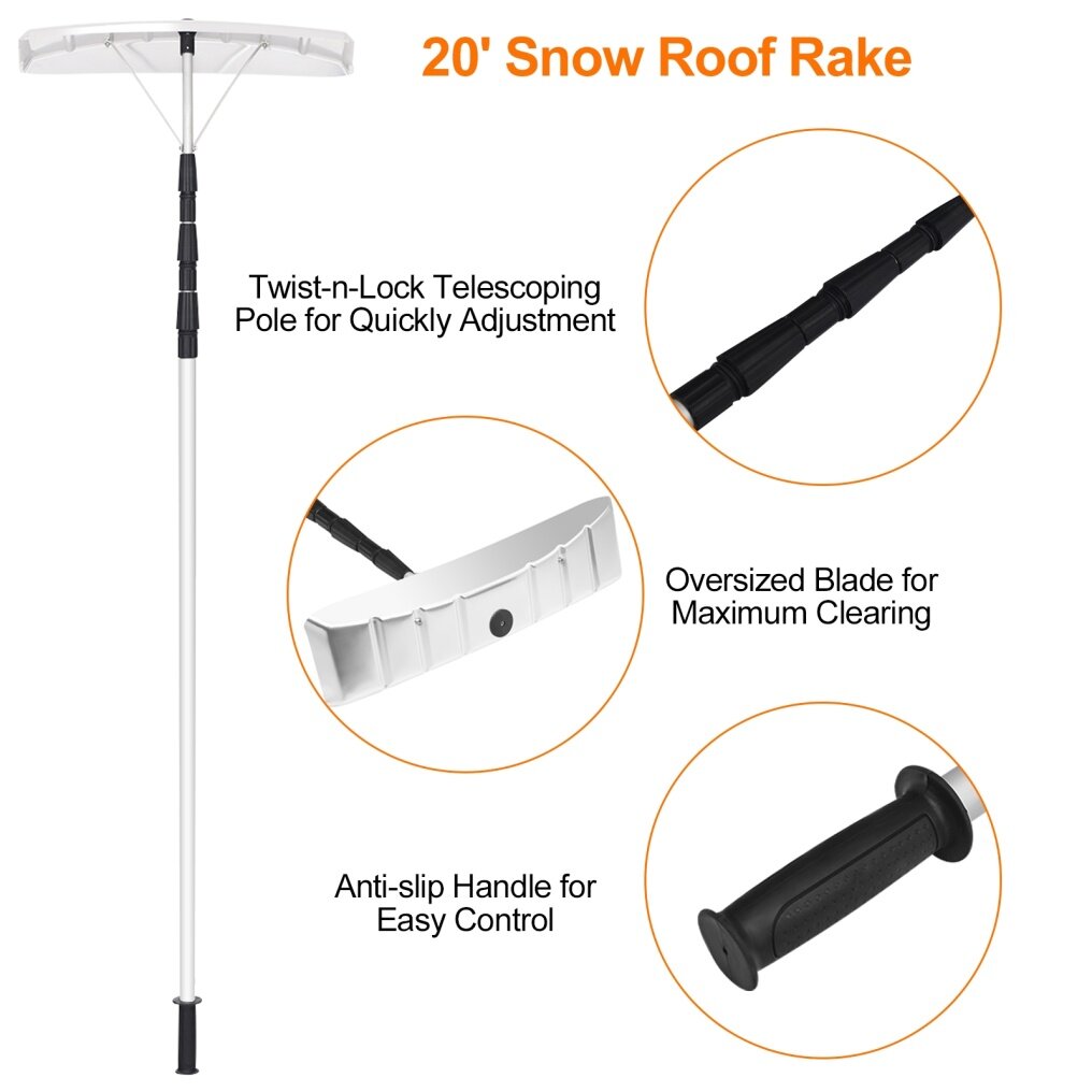 You can twist the height lock to adjust the height of the pole, and reach farther places overhead just standing on the ground. You don't worry the rake head will hurt you because its smooth angles. The blade or head of this rake is large so that it can hold more snow at one time so you can clean up the roof almost using no time. In terms of storage, in snowy days, you can save space by shortening height of the rake and putting it in a corner. In warming days, just disassemble it and put it box.