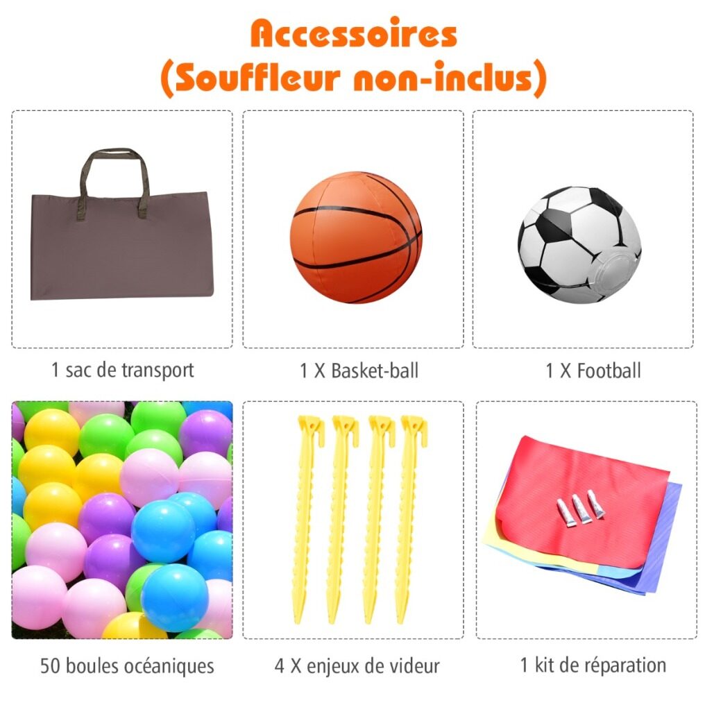 Best Gift for Kids: Equipped with complete accessories such as a repair pack, basketball, soccer, and 50 ocean balls, this bouncer can be a perfect holiday gift for your kids. And bright colors shapes can attract your kids to play for hours and enjoy family fun, thus providing your kids with a happy and fulfilling childhood.