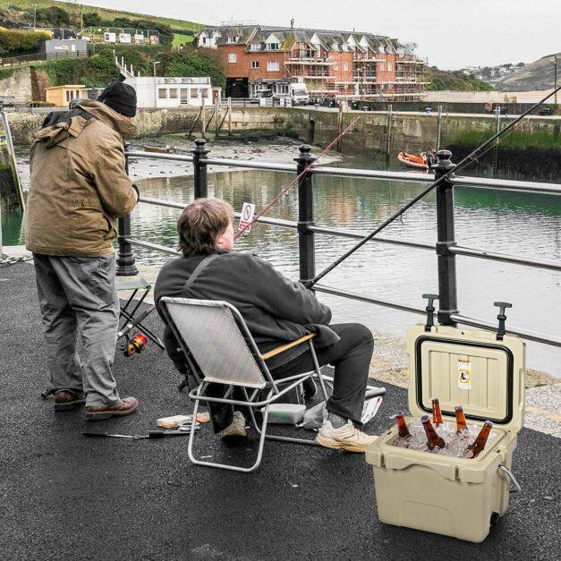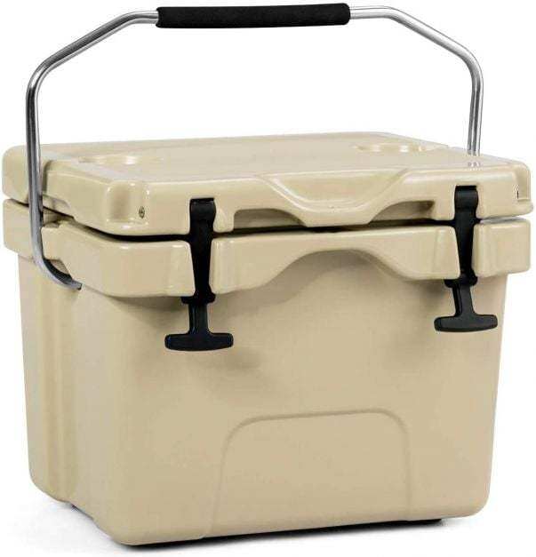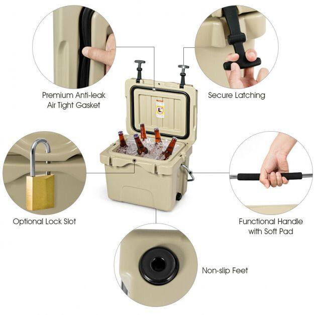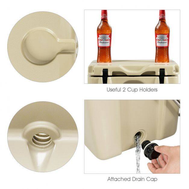 Premium insulation keeps ice cold for four days Integrated structure effectively prevents leakage of water. Reinforce locking latches for added security Lightweight design allows you to take it effortlessly. 24 cans capacity without ice to meet outdoor activity demands A good helper for you when going outside. Wide application for picnic, camping, self-drive travel and finishing. Durable construction is shatter-resistant and stands up to the rigours of the journey. Ant-slip feet at the bottom increase friction with the ground. 2 cup holders in the top Molded hole on the lid & liner by adding a lock (not included) Comes with drain plug to empty out water. Environmentally friendly and energy conservation
