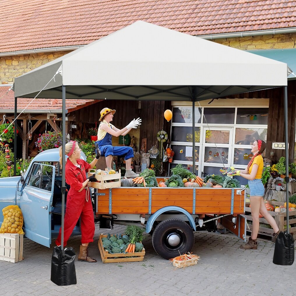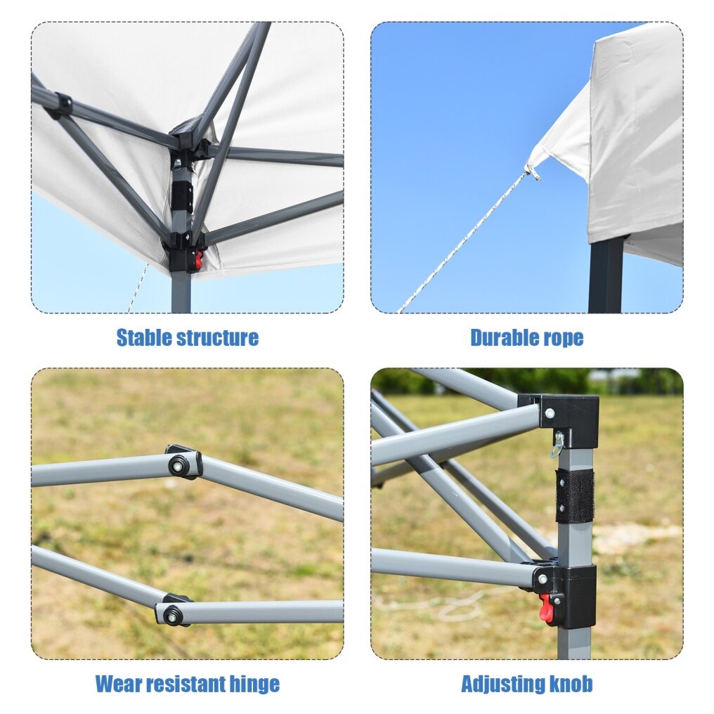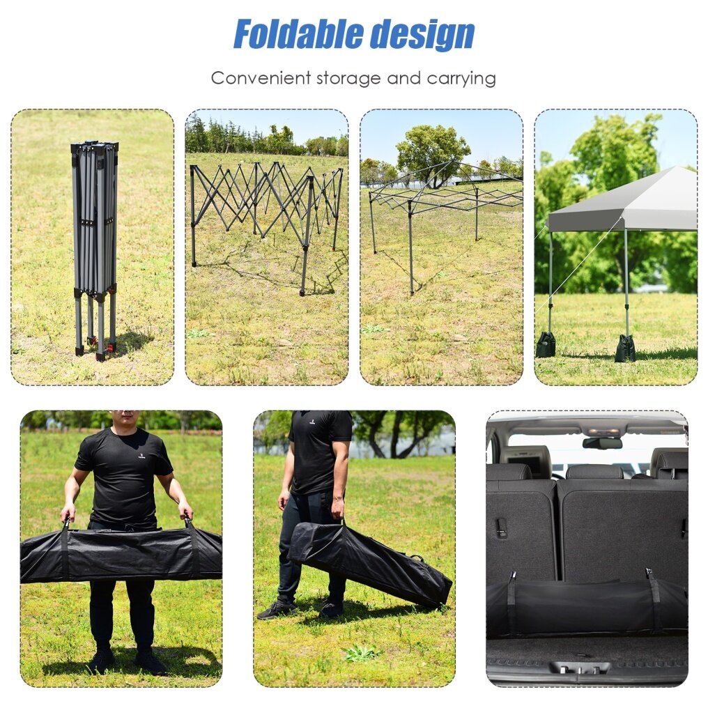 Sturdy Frame with Adjustable Height: The frame of this folding canopy is made of premium steel, which is sturdy and durable. Comes with stakes, wind ropes and large capacity sandbags, the frame of the tent will be stable in breezy days. And the height of canopy can be adjusted with three positions.