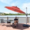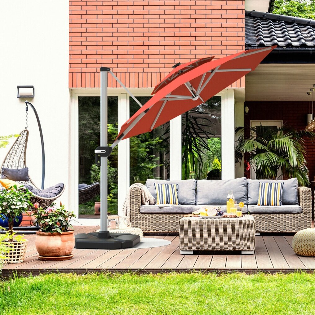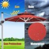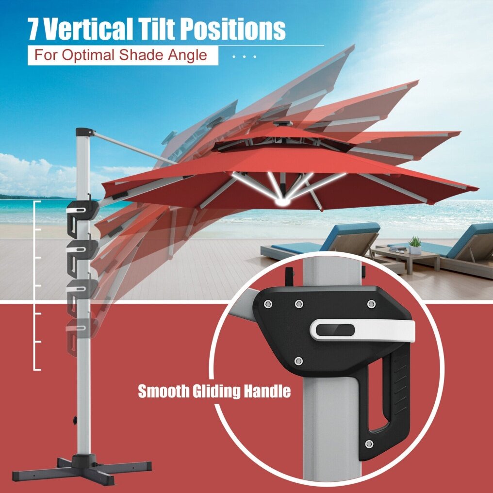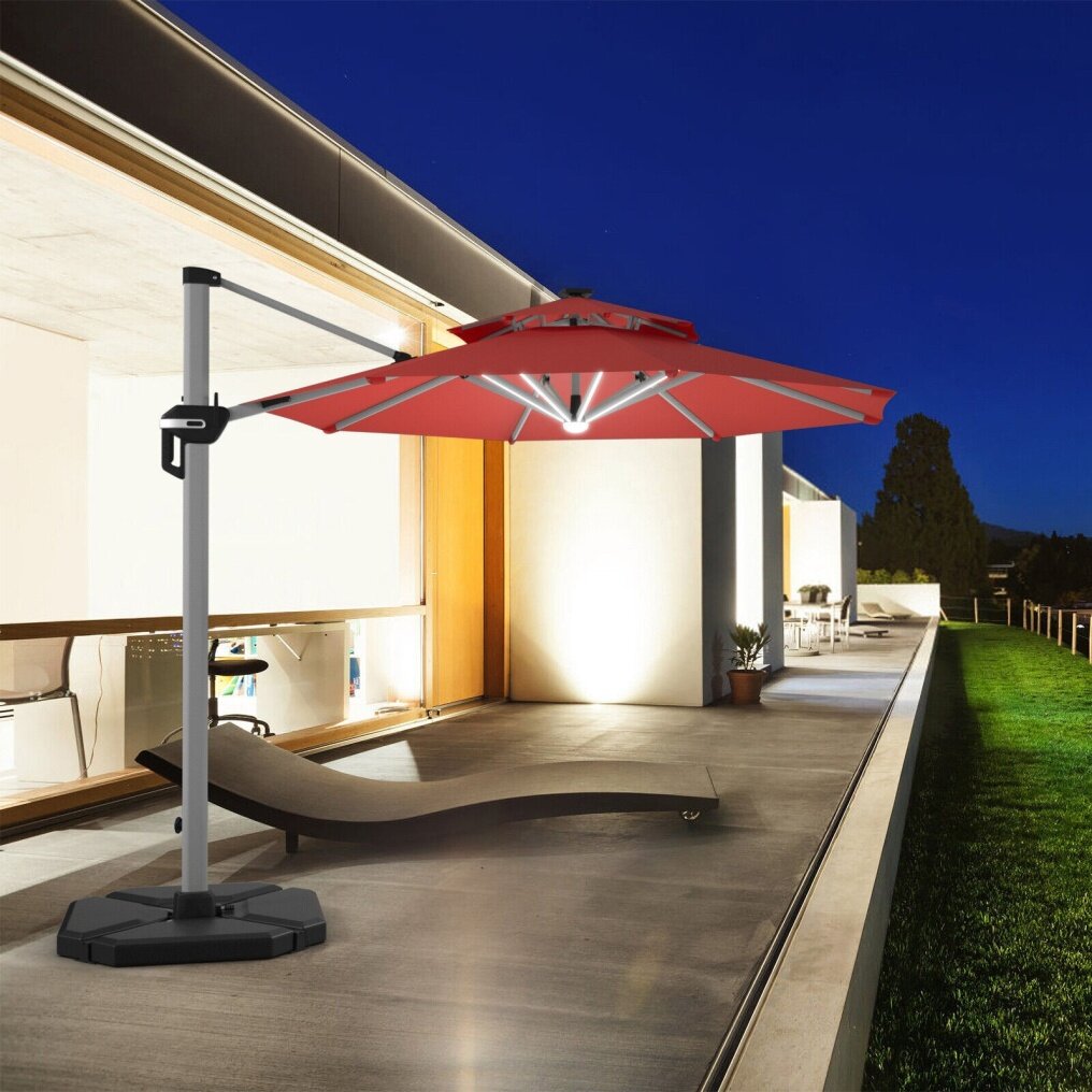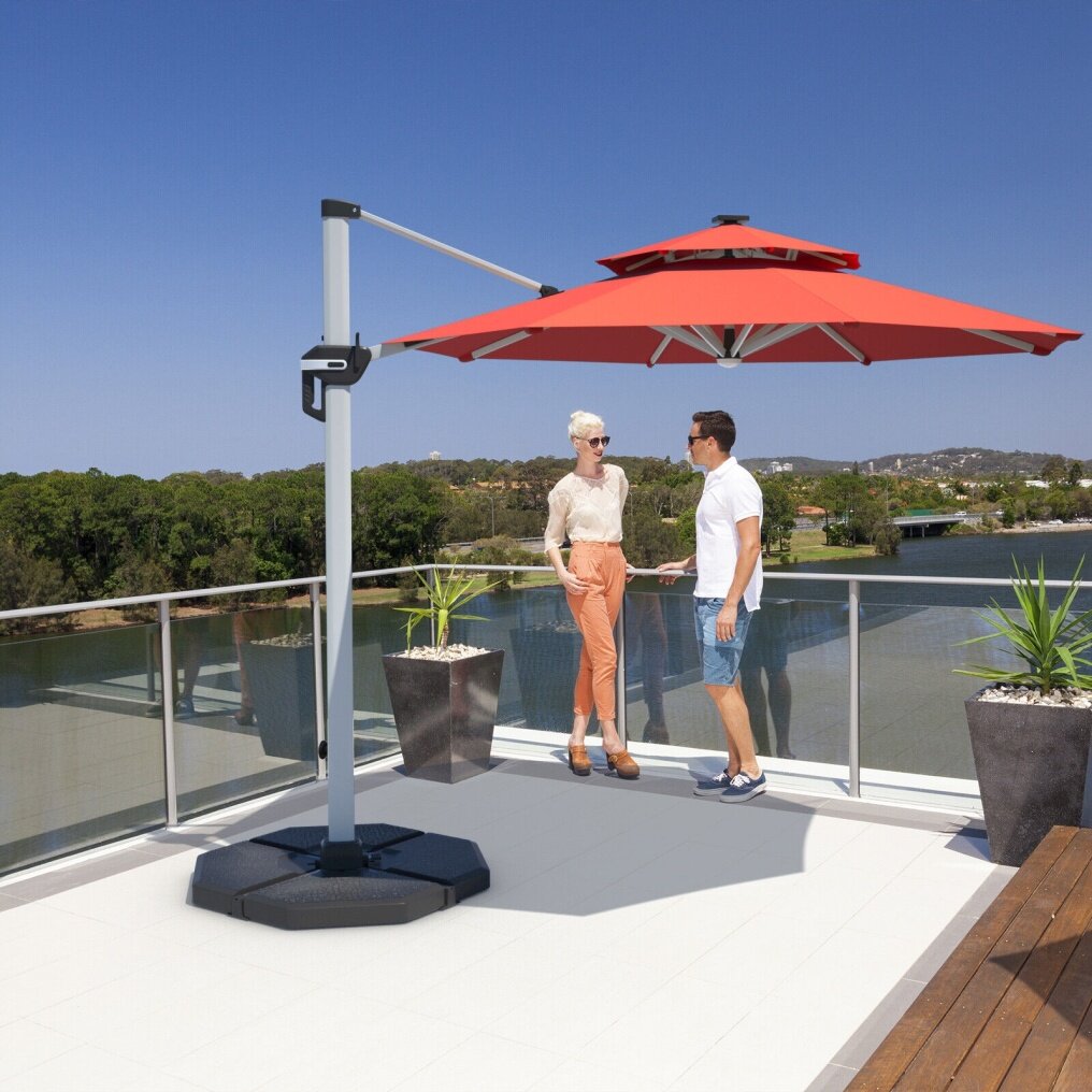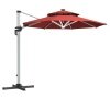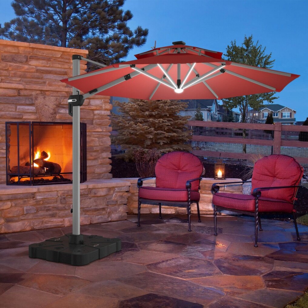 Durable polyester canopy provides more shade area for you and your friends. In addition, it is fade-resistant, water-proof and sun-protection to be perfectly used outdoor without too much glare sunlight. 360 degree rotation function and 7 tilt settings satisfy your various needs. LED lights on the frame for bright up your space for more enjoyments. Moreover, there is a strap for conveniently closing the canopy. This patio umbrella brings a wonderful outdoor leisure time!