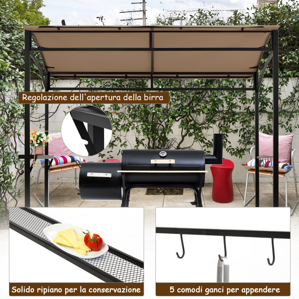 Storage Shelf & 5 Utensil Hooks: Equipped with extra metal shelf, the grill gazebo provides enough space to place kinds of items for convenient use, such as grill accessories, tableware, beverages, food, etc. Besides, it also includes five hooks for hanging tools. And the small notch on the shelf can help you open the beer.