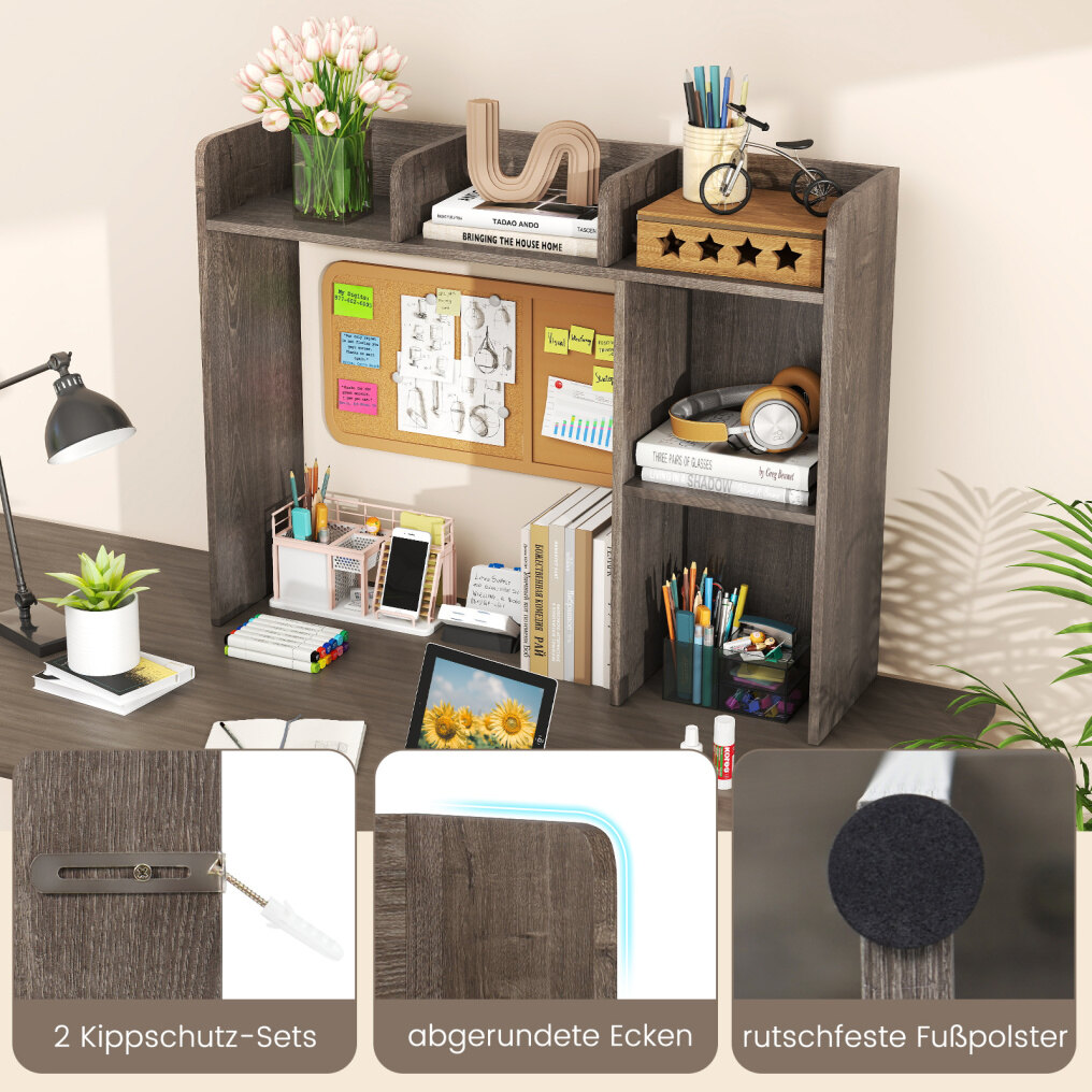 Is your desk always a mess? Create space and avoid clutter with this desktop bookshelf! Place it on your computer desk and you'll still have plenty of room for your monitor while it increases storage space. The three shelves and two compartments are spacious enough to store books, jewelry, and other work essentials. Thanks to its thick engineered wood panel and sturdy construction, the shelf can support up to 45 kg. Furthermore, with two anti-tip kits and non-slip feet, it's unlikely to wobble or tip over on your work surface. Use it with confidence!