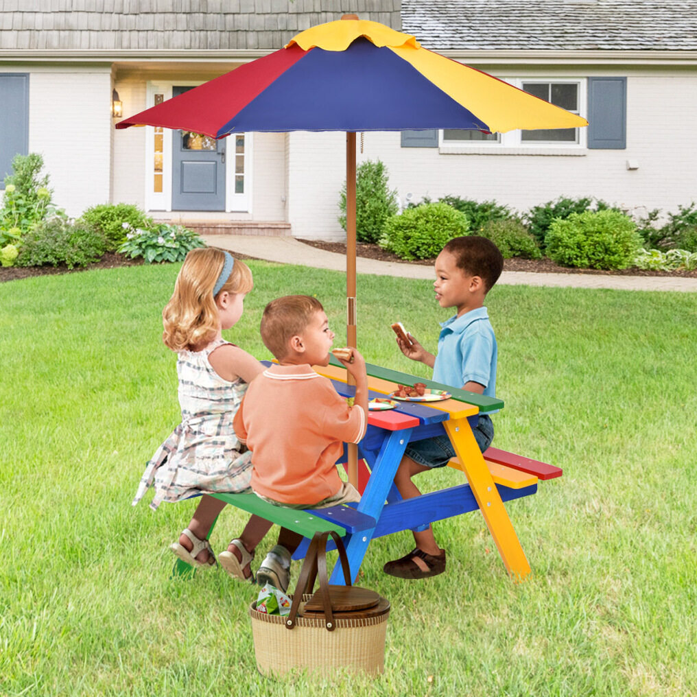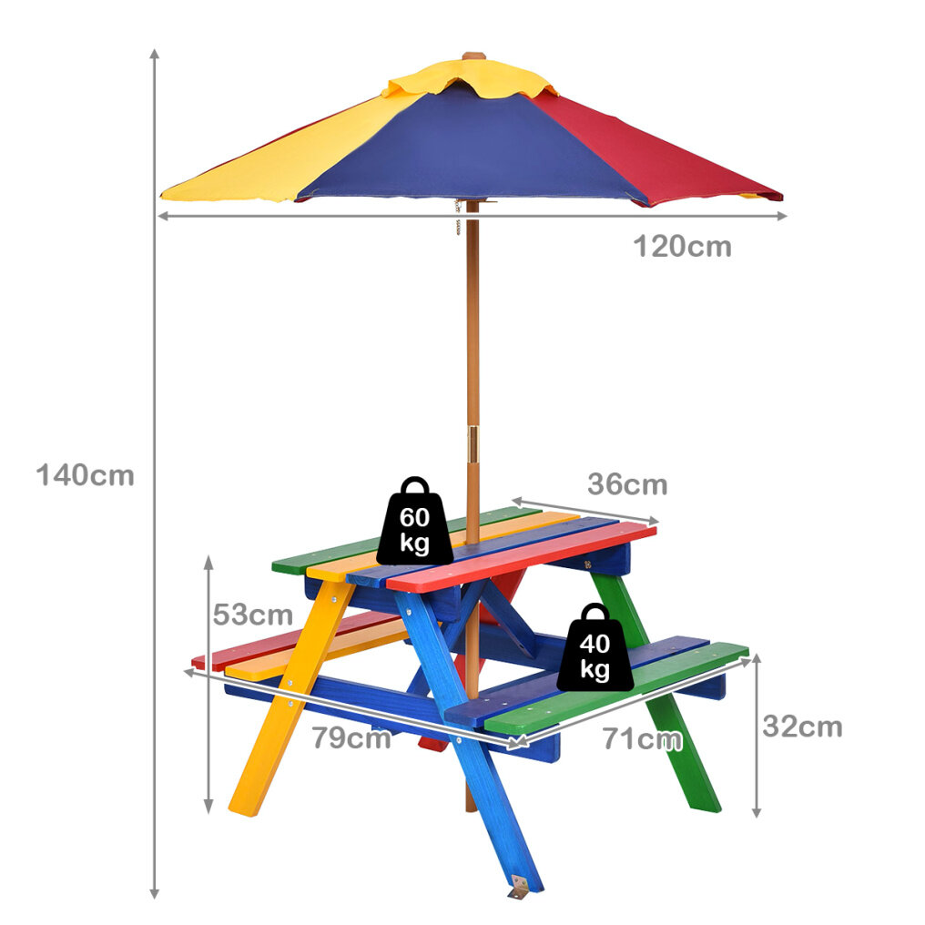 Constructed by premium eco-friendly natural fir wood, secure for kids to use, this picnic table is stable and sturdy in structure with good load-bearing, not easy to damage. Four children can sit comfortably for social play and interaction. With an umbrella canopy, this picnic table is perfect for your kids to enjoy their meals or snacks outdoors.