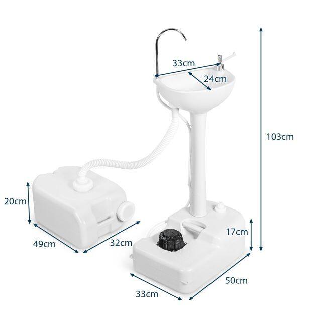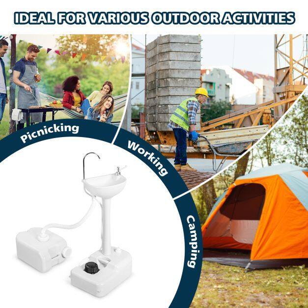 ● Portable Handle and Built-in Wheel: Weighing only 11 lbs, this camping sink is easy to be carried to anywhere. Moreover, the built-in handle adds portability and the bottom lets you effortlessly move the hand wash station basin. The portable sink can be fixed stably via the ground hole as well.