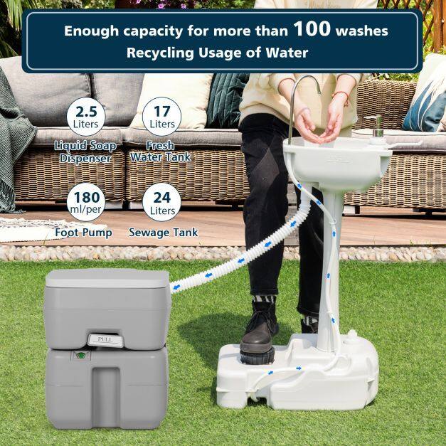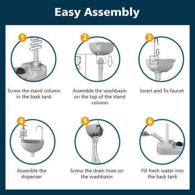 ● Quality Material and Easy Assembly: Made from high-quality HDPE material, the portable sink is safe and suitable for family use. Besides, the camping sink is sturdy and durable enough for long-term service. No tools needed, this hand wash station basin can be assembled easily with the clear manual.