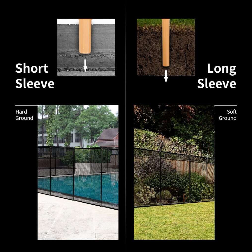 ● Two Types of Sleeves for Different Use: Two plastic cap sleeves with different lengths are suitable for soft surfaces such as grass, mud ground, etc. While short sleeves are suitable for hard surfaces such as cement ground, asphalt, etc. This fence is suitable for both swimming pool and courtyard.