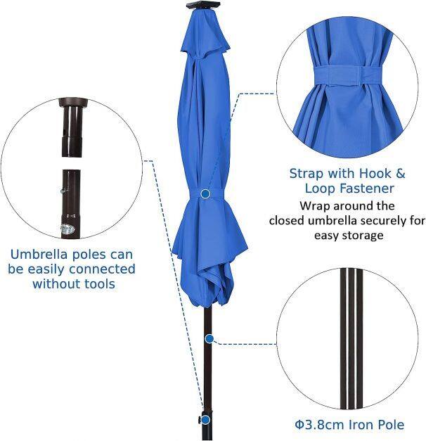 ● Easy to Assemble and Use: With easy-to understand instructions delivered, this patio umbrella can be quickly assembled without complicated process. The innovative crank allows you to effortlessly open and close the umbrella in seconds. When not in use, the sewn-in hook and loop fastener straps can easily wrap around the closed umbrella for convenient storage.