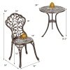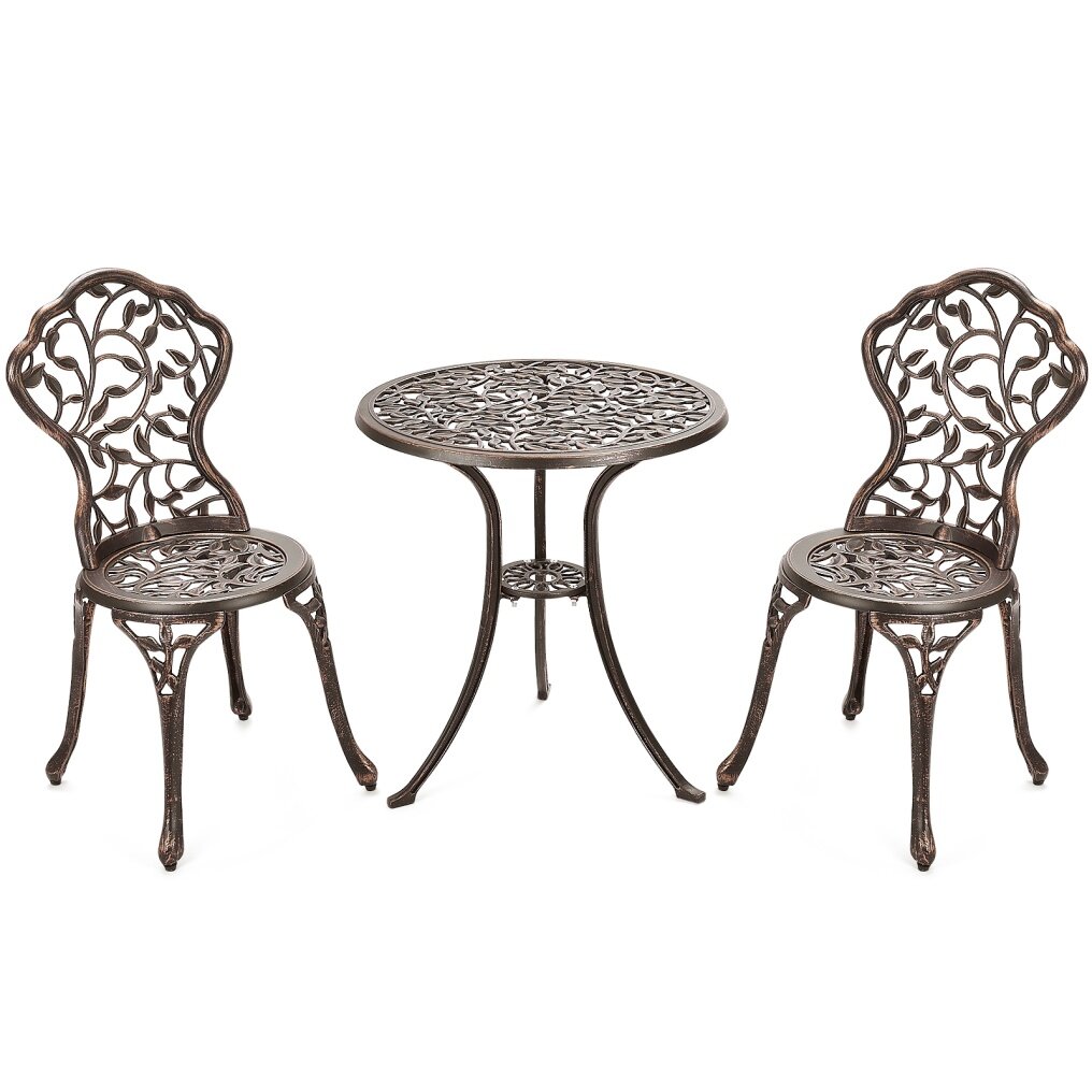 Made of cast aluminum, the bistro set is strong and durable. It features an attractive leaf design in an antique copper finish. Simple yet elegant, this bistro set is great for outdoor brunches or an afternoon tea on your front porch or any outdoor area.