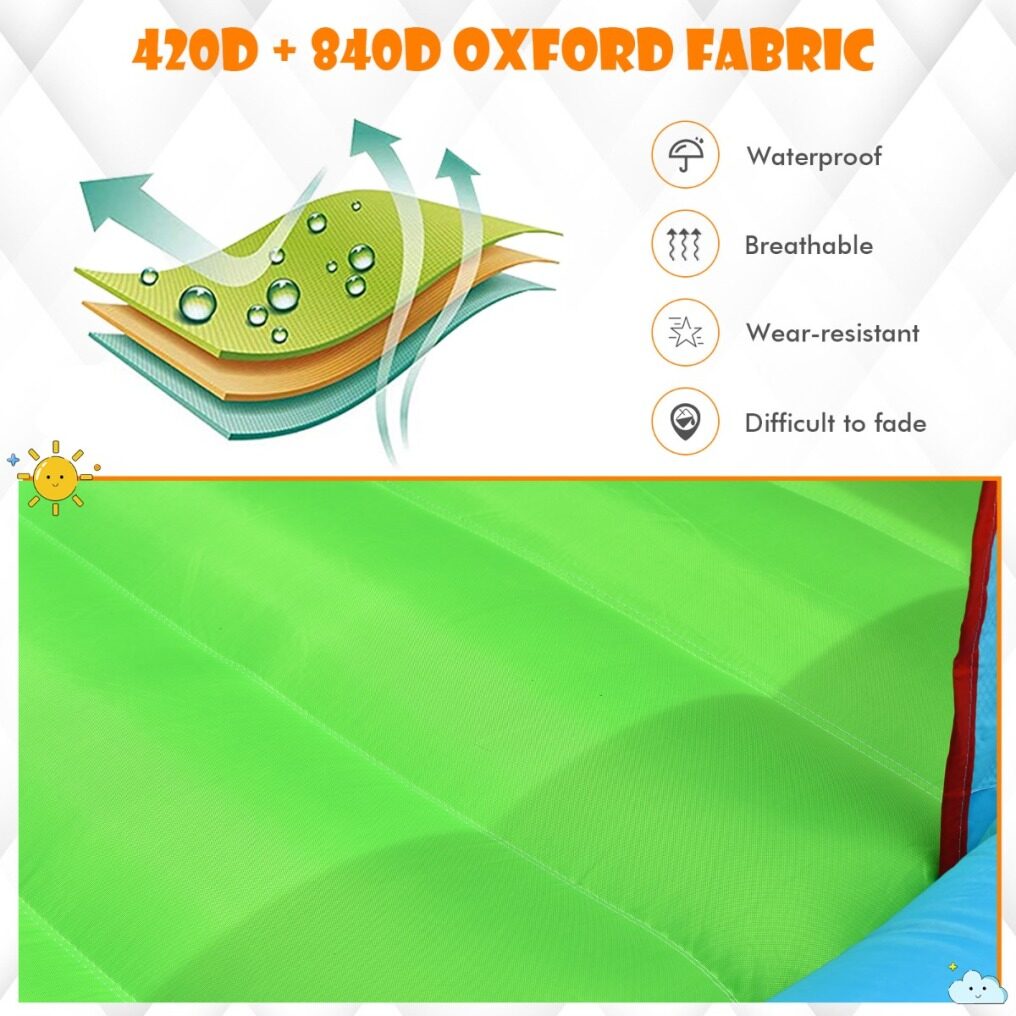 With 2 slides, a climbing wall, a large jumping area and a basketball rim, our bouncing house allows children to enjoy extra fun of various games at the same time. It is good for your child to develop motor skills and increase their interests. Oxford surface makes it safe, durable and easy to clean, ensuring long service life. And the bounce castle uses mesh wall stakes, durable straps to achieve additional security. The long air outlet tube brings a lot of convenience in rapid inflation and deflation. What's more, the carrying bag lets you take the bounce house anywhere without too much effort. Give children a happy childhood with this attractive inflatable bounce house!
