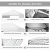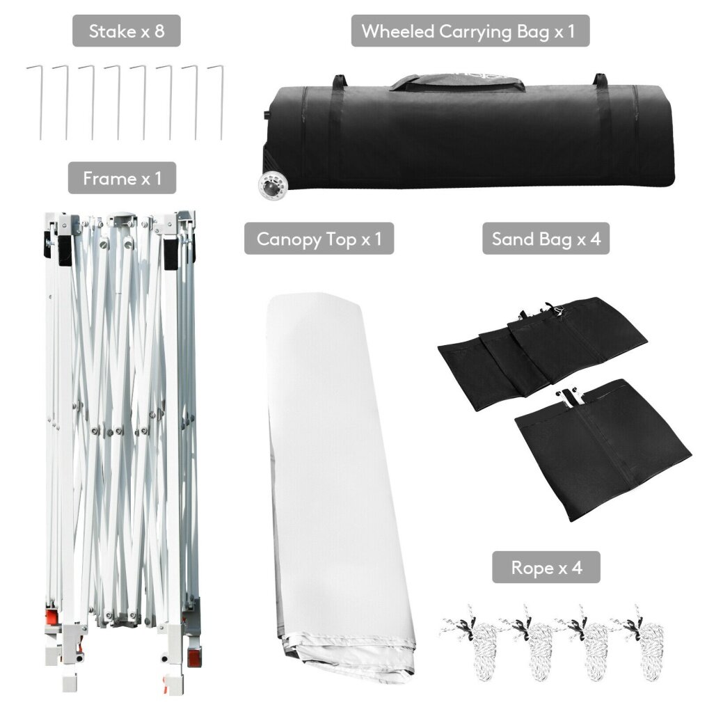 Constructed with sturdy metal frame and weather-resistant cover, this sun shelter ensures long-term use. Plus, extra four sandbags and metal stakes enhance durability and safety while using. With the 3 adjustable heights, you can easily set a humanized height as needed. And dual side awnings can be changed into 3-position inclination, creating additional shade and protection. Covered by sunray blocked canopy awning, our instant shelter can offer 170 square feet of shade coverage. So you can enjoy breeze under the shade in outdoor activities, such as camping, marketing, and BBQ. When it is not in use, you can fold the tent into a wheeled carrying bag, which facilitates storage and transportation.