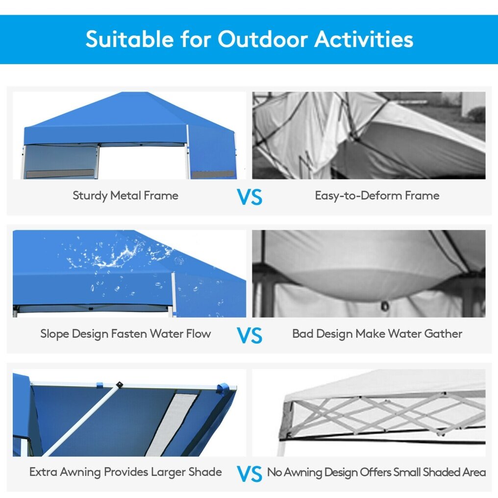 The pop up canopy with adjustable instant sun shelter provides you with a cool and comfortable place to relax and enjoy beautiful outdoor scenery.