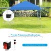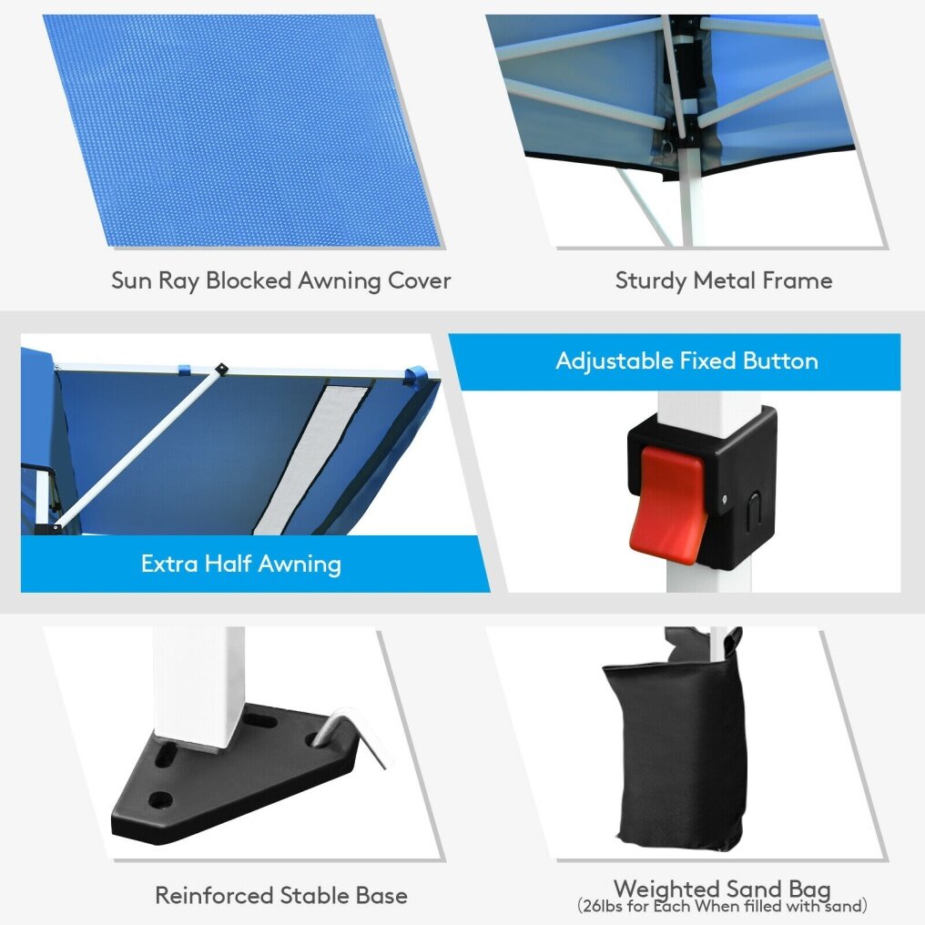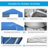 Constructed with sturdy metal frame and weather-resistant cover, this sun shelter ensures long-term use. Plus, extra four sandbags and metal stakes enhance durability and safety while using. With the 3 adjustable heights, you can easily set a humanized height as needed. And dual side awnings can be changed into 3-position inclination, creating additional shade and protection. Covered by sunray blocked canopy awning, our instant shelter can offer 170 square feet of shade coverage. So you can enjoy breeze under the shade in outdoor activities, such as camping, marketing, and BBQ. When it is not in use, you can fold the tent into a wheeled carrying bag, which facilitates storage and transportation.