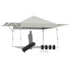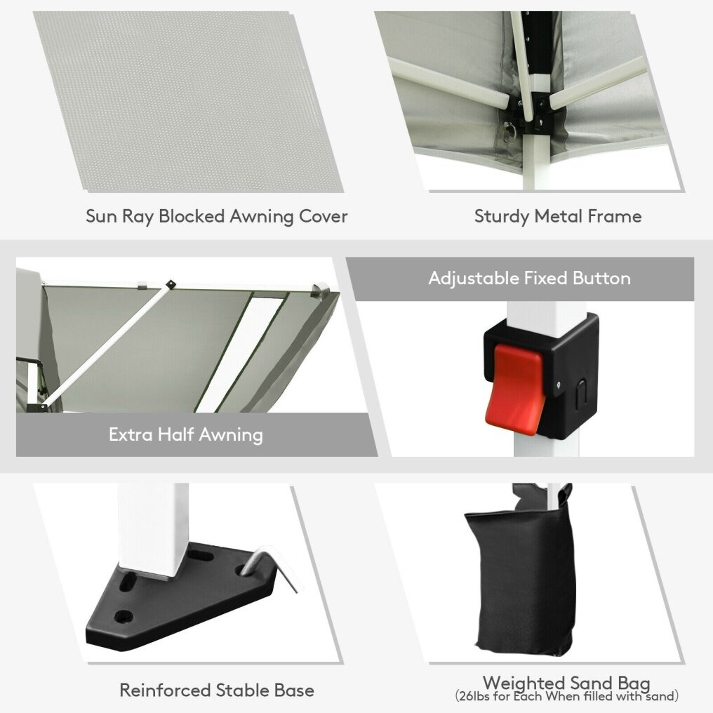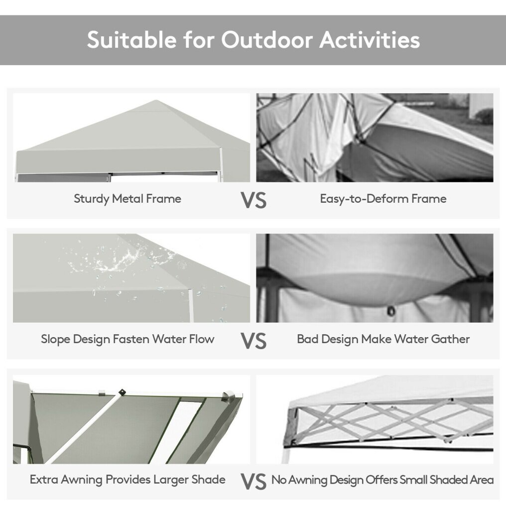 Constructed with sturdy metal frame and weather-resistant cover, this sun shelter ensures long-term use. Plus, extra four sandbags and metal stakes enhance durability and safety while using. With the 3 adjustable heights, you can easily set a humanized height as needed. And dual side awnings can be changed into 3-position inclination, creating additional shade and protection. Covered by sunray blocked canopy awning, our instant shelter can offer 170 square feet of shade coverage. So you can enjoy breeze under the shade in outdoor activities, such as camping, marketing, and BBQ. When it is not in use, you can fold the tent into a wheeled carrying bag, which facilitates storage and transportation.