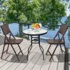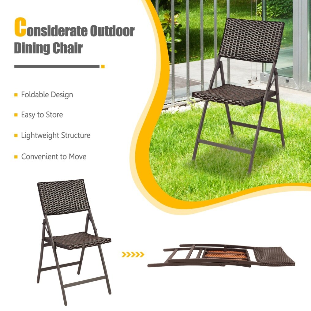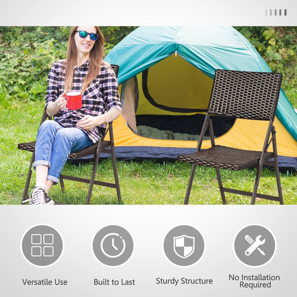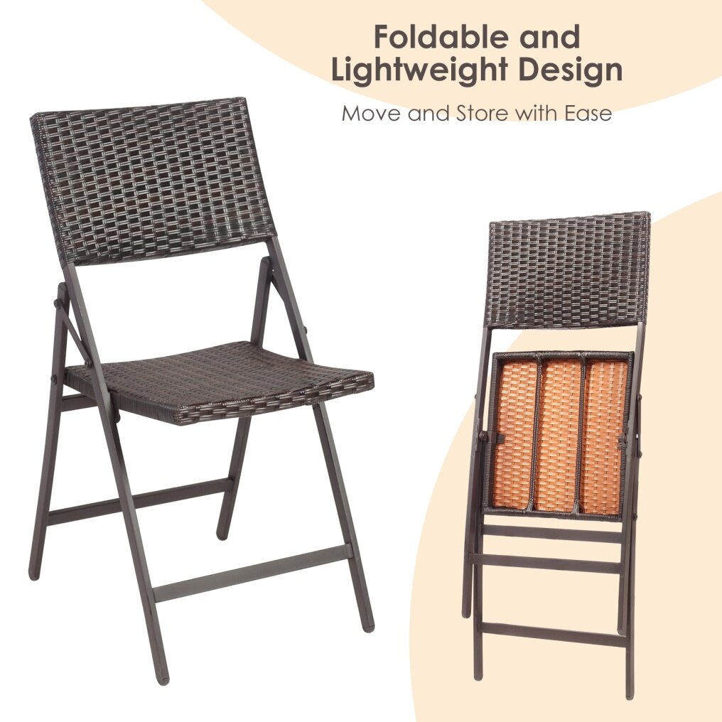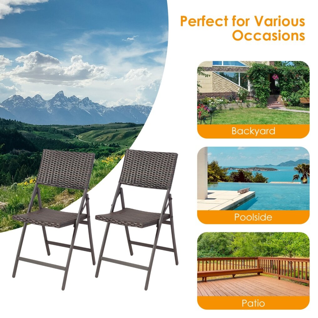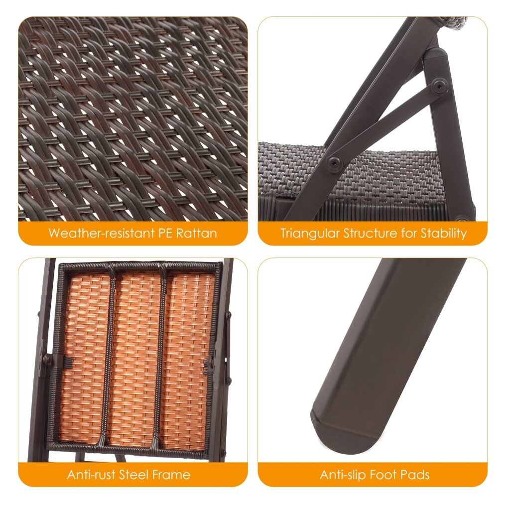 ● Set of 2 Folding Rattan Chairs: This outdoor patio furniture set includes 2 folding rattan chairs, which allows you to enjoy the relaxing outdoor times with your partner or friend. They are also perfect additional seats for extra guests. Besides, an adequate seat height of 18" off the ground can perfectly fit most outdoor dining tables (not included).