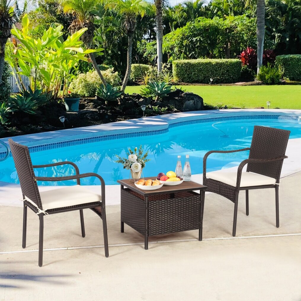 ● A Place for Relaxation: This high quality wicker bistro set comes with 2 cushioned chairs and 1 spacious coffee table which allow you and the one you loved to enjoy outdoor leisure time together. Therefore, it is the perfect addition to the poolside, garden, backyard and patio, etc.