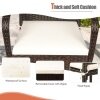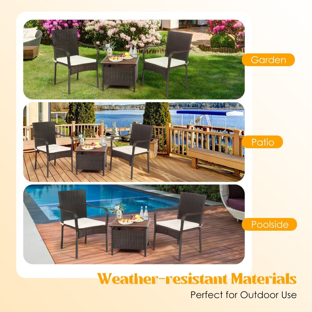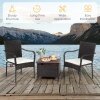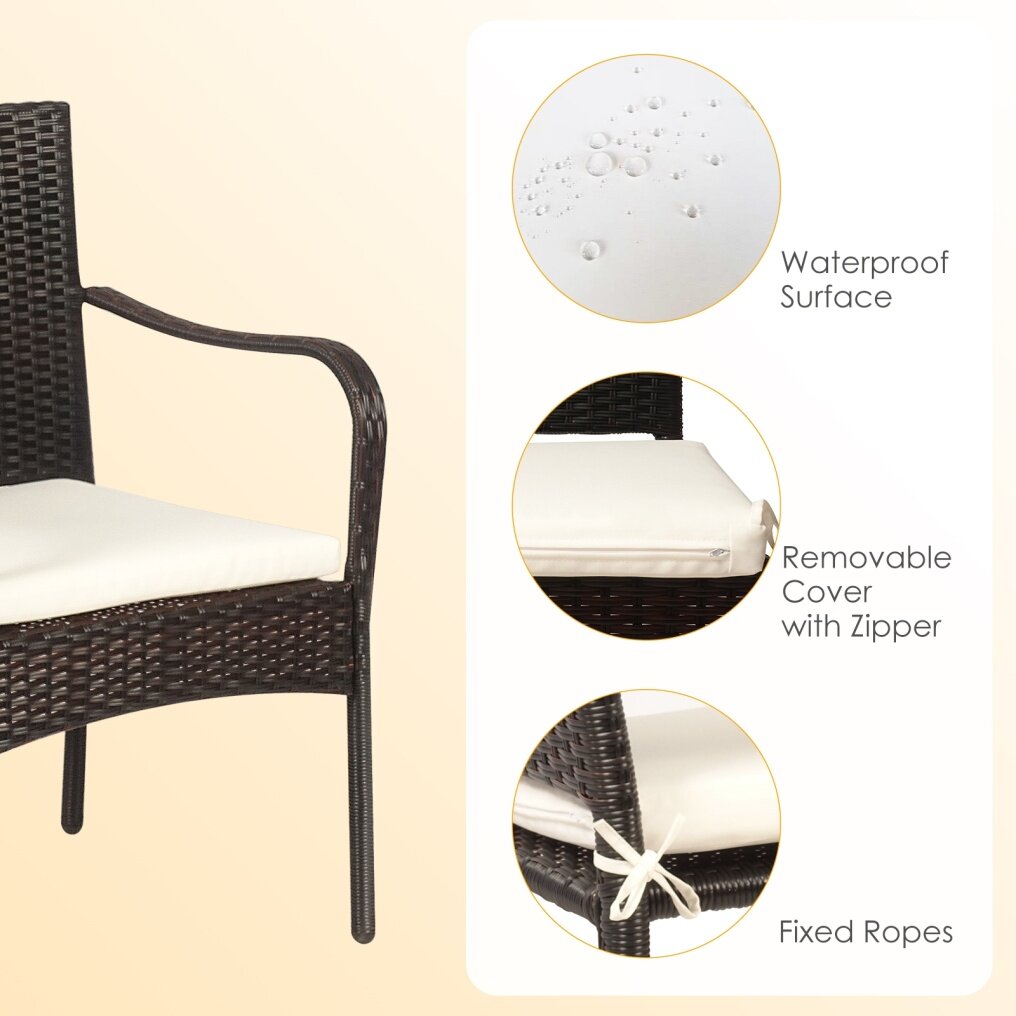 ● 2 Stackable Chairs: Equipped with 2 ergonomic chairs with waterproof cushions, this rattan patio furniture set offers comfortable sitting experience. Meanwhile, there are 4 ropes on each cushion so that you can fix them with chairs tightly. After using them, you can stack 2 chairs together to save space.