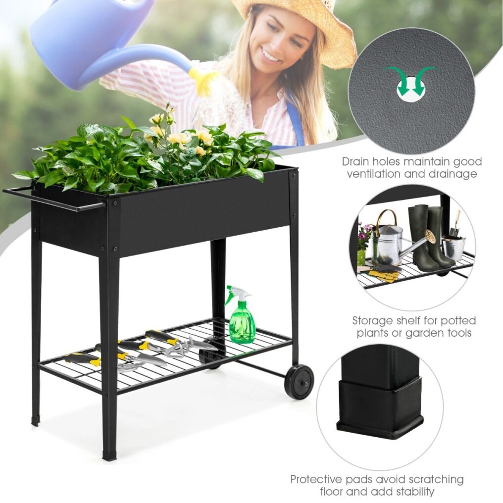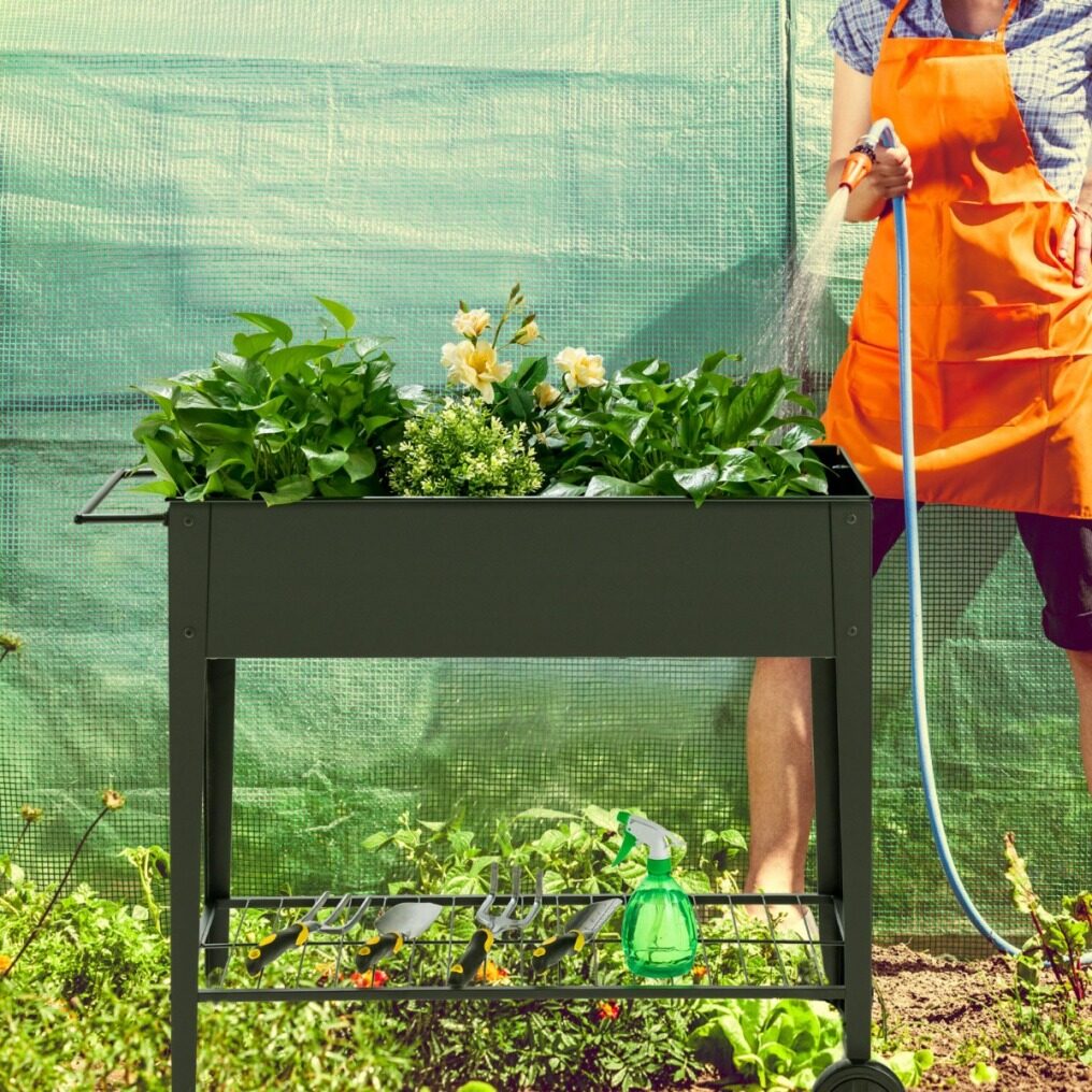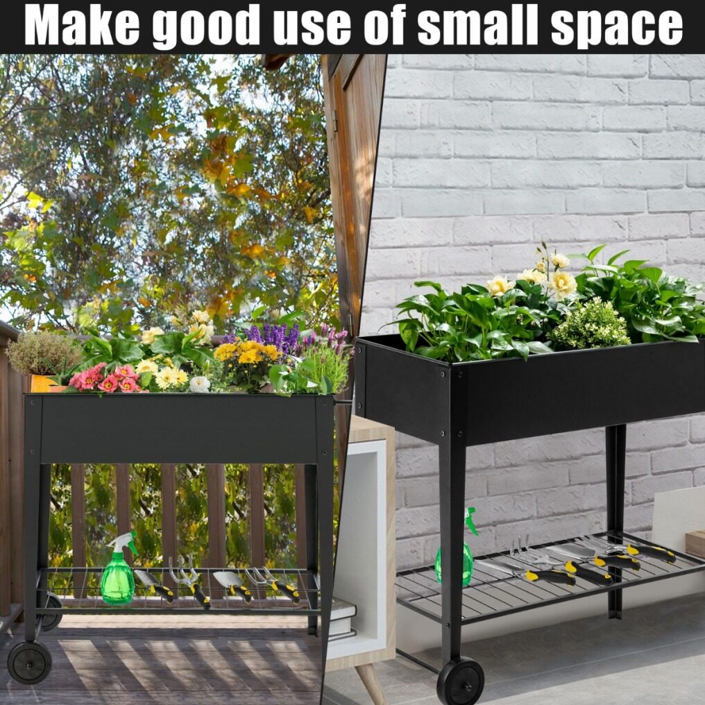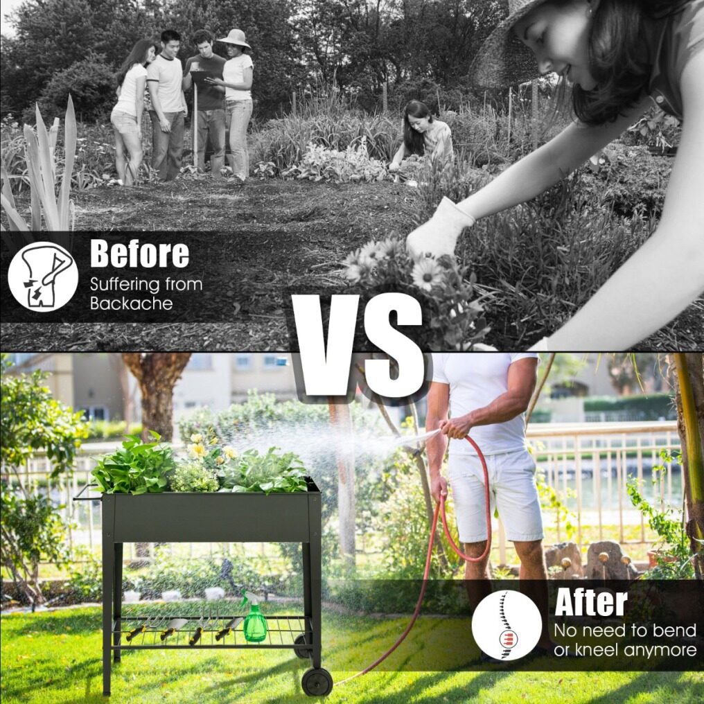 The elevated garden bed will be a good partner to help you build a green world! Large box on the top allows you to raise a variety of plants and flowers, such as vegetables, ferns and other plants. And you can put your tools, shovels, watering pots on the wide bottom shelf. Made of premium metal material, the outdoor garden box can serve you for a long time without breaking. It comes with an ergonomic handle and 2 smooth wheels, which makes it easy to move anywhere. What’s more, the drainage holes are specially designed for better ventilation and avoiding flooding. The portable garden bed with suitable height enables you to garden without having to bend over. It is ideal for indoor and outdoor, including garden, patio, balcony and living room. Start and enjoy your gardening with your family or friends!