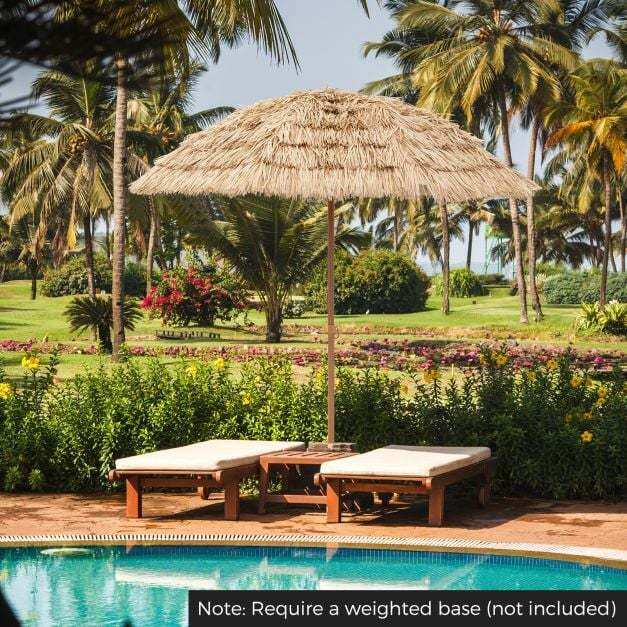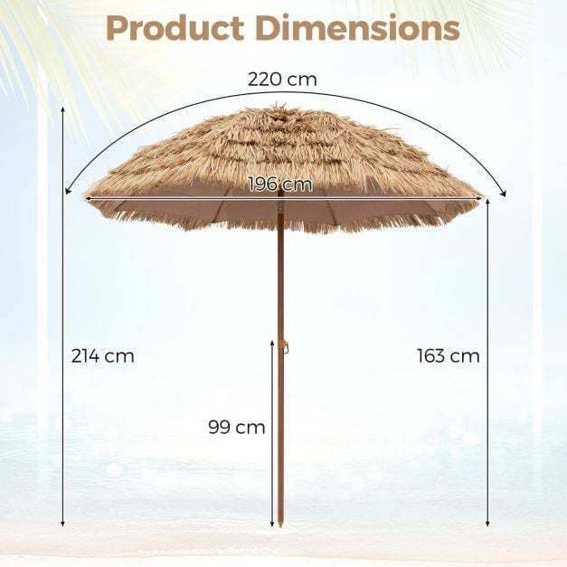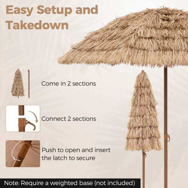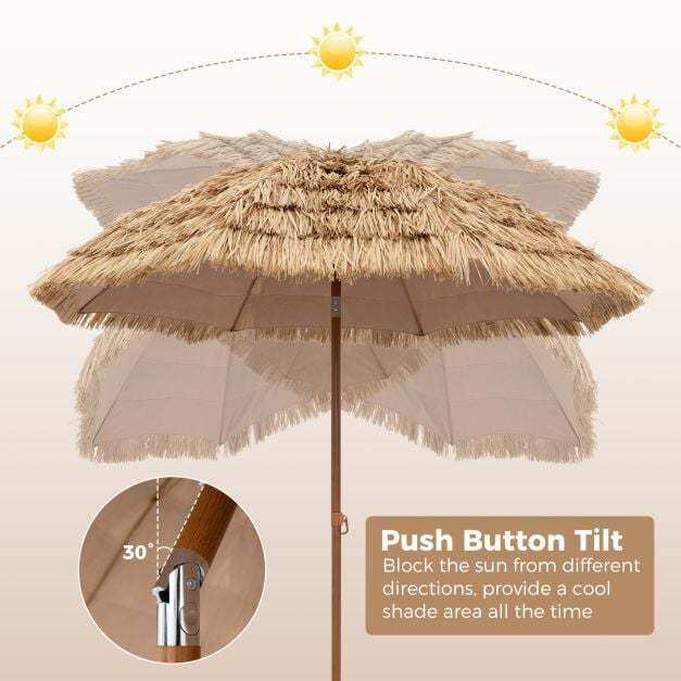 Push Button Tilt: The hula thatched tiki umbrella features a tilt mechanism, allowing you to adjust the canopy up to 30° to the left or right, so as to block the sun from different directions. Moreover, its user-friendly one push button makes it easy to operate.