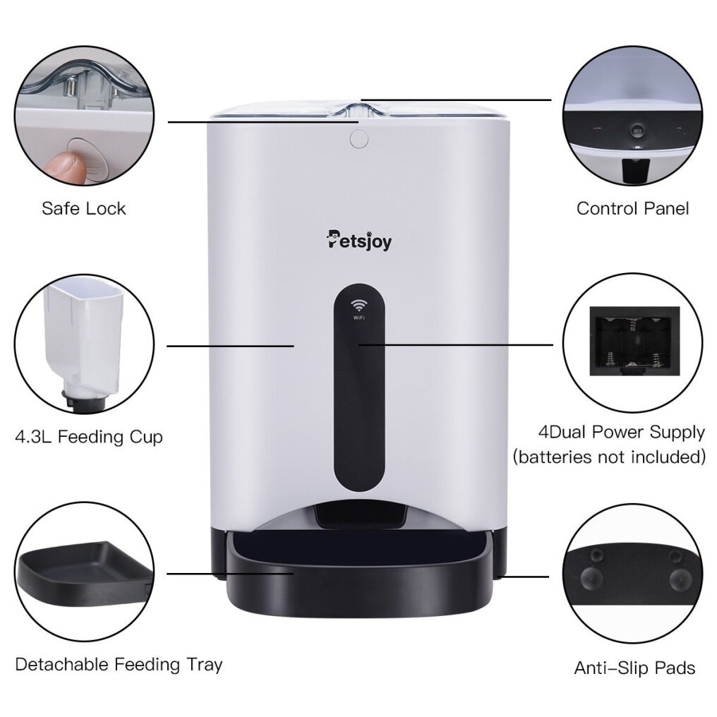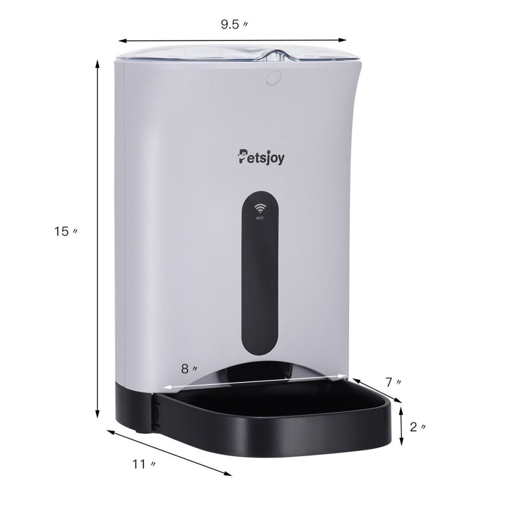This automatic pet feeder can help feed your lovely pets and help them keep good eating habits. It is controlled via APP, and meal call can be made in advance on smart phone APP and played automatically when the food comes out from smart pet dispenser. You can feed your pet at any time and place. It is convenient for you to feed your pets.