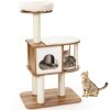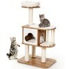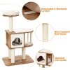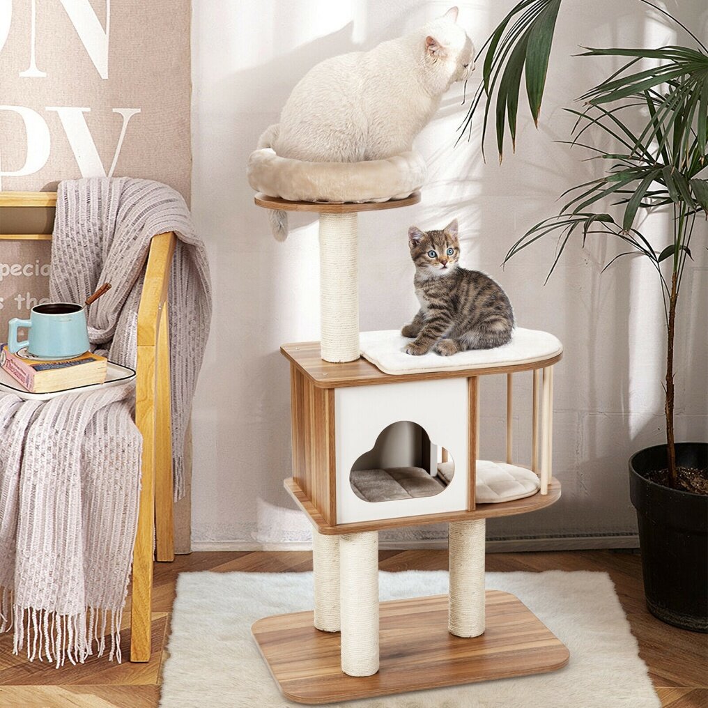 Multi-level design offers a place to climb, jump, scratch, play and sleep for your cute cats. This cat tree is made of premium engineered wood, sisal ropes and soft cushion which is very sturdy, durable and comfortable. With the nice looking, our wooden cat tower is suitable for different home décor. And the assembly is very easy with detailed instruction.