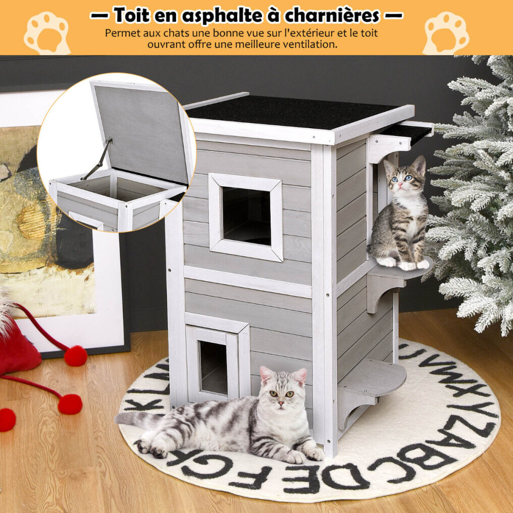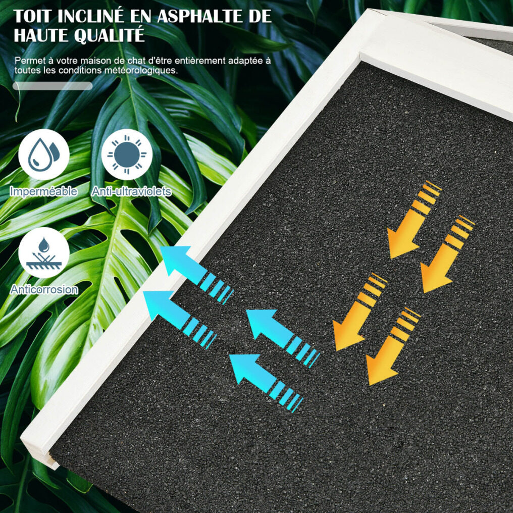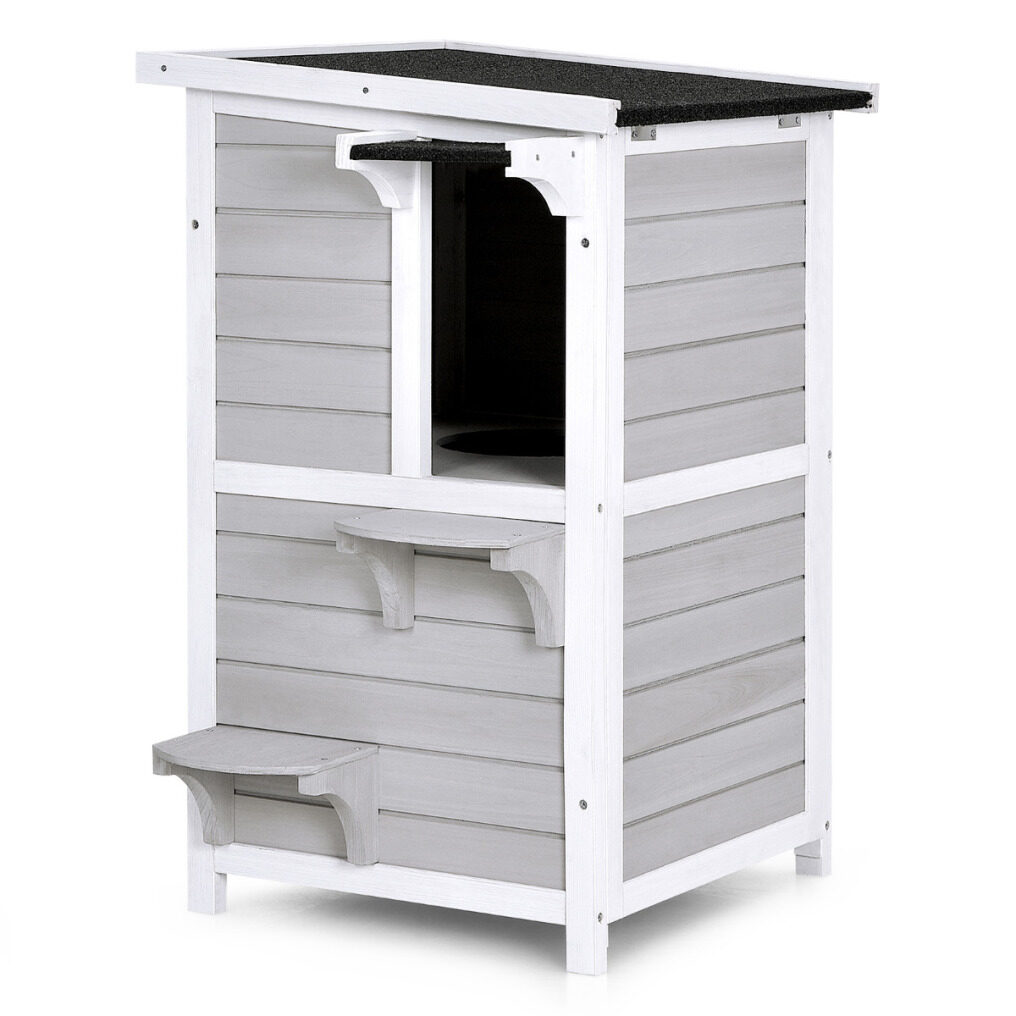 ● Indoor and Outdoor Cat Shelter: This wooden cat condo has an asphalt roof and eave that are water-proof and sun-proof. Therefore, it is adaptable for both domesticated and stray cats indoors and outdoors. The tilted roof also keeps the rainwater from accumulating.