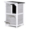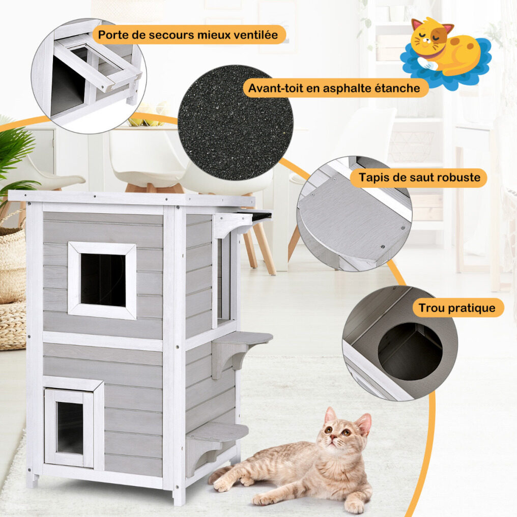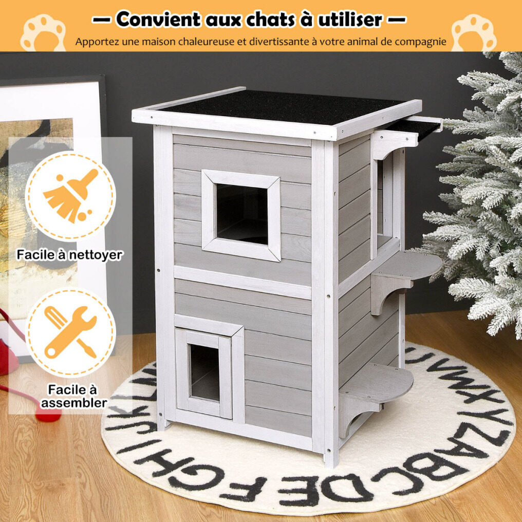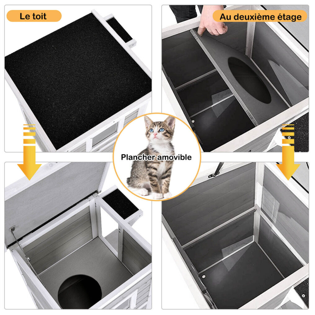 ● Indoor and Outdoor Cat Shelter: This wooden cat condo has an asphalt roof and eave that are water-proof and sun-proof. Therefore, it is adaptable for both domesticated and stray cats indoors and outdoors. The tilted roof also keeps the rainwater from accumulating.