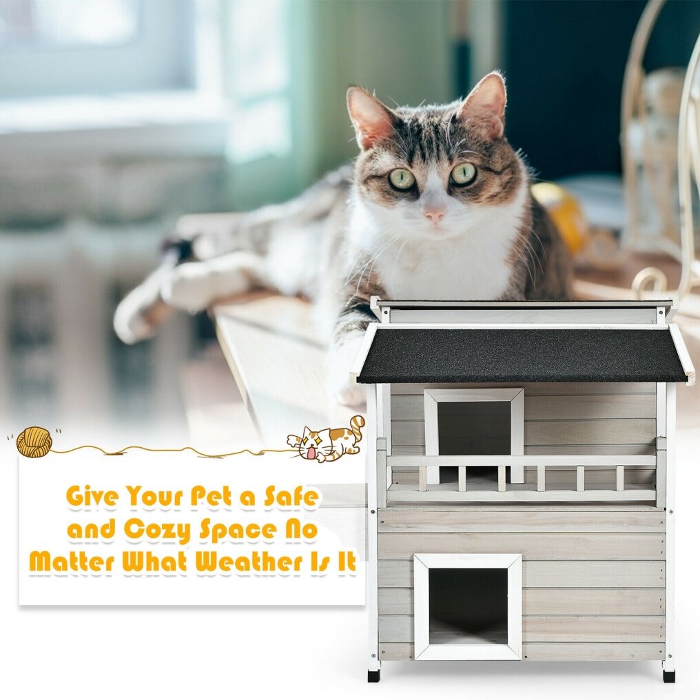 2-story design with a balcony makes sure your cats get enough rooms for playing and resting. And the jump platform gives cats a lift to leap towards the second floor and for fun. It is suitable to stand indoors and outdoors with a water-proof and sun-proof asphalt roof. Using firwood as the main frame, this cat condo is durable and reliable while 4 raised legs guarantee a stable standing. It is a sweet home for cats, bunnies, small and medium-sized dogs. Besides, it is easy to assemble following the attached instruction.