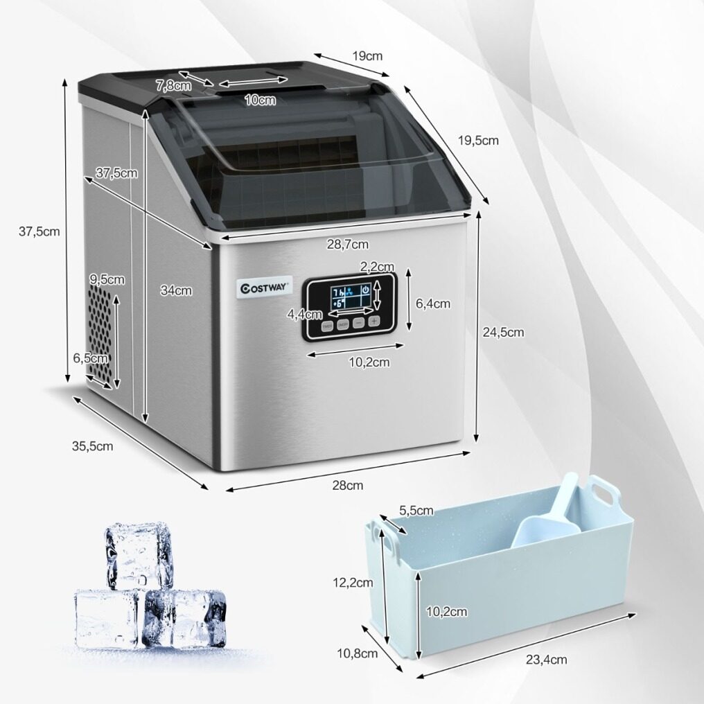 Nothing is better than having an iced coffee or beer in hot weather. The portable ice maker makes many more ice cubes as needed. The ice maker features a superior compressor that ensures high efficiency and good thermal insulation to ensure a safe working condition. The stainless steel housing not only prevents corrosion for a long-lasting shine but also ensures a longer service life. Various indicators on the LCD display show you important information from water shortage to basket overflow. In addition, the self-cleaning function ensures that the machine stays constantly clean and you don't have to deal with manual cleaning. Bring the compact ice maker to your kitchen, cafe or restaurant to make crystal clear square ice cubes.