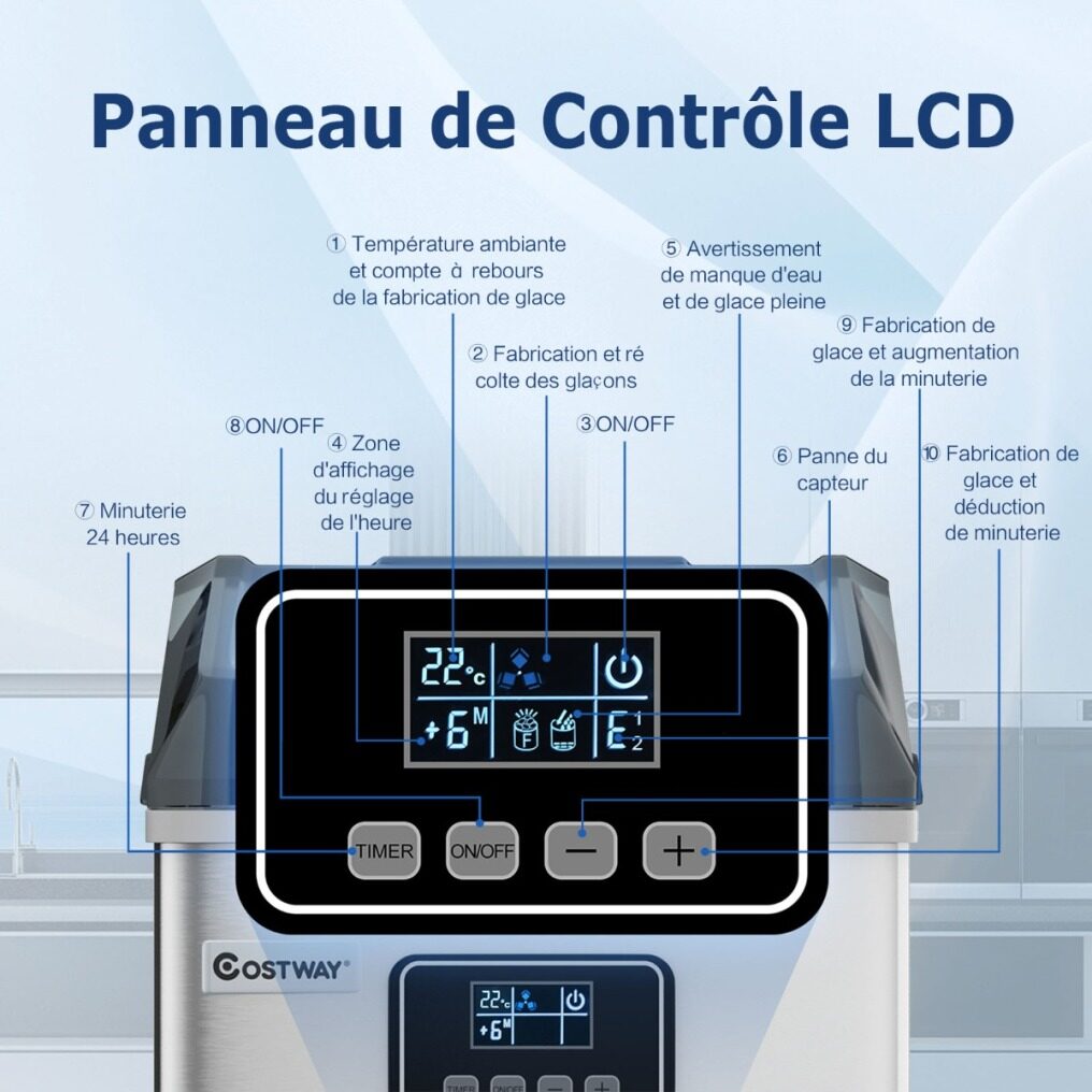Intelligent LCD display panel : The ice maker responds quickly to every tap of the corresponding button in the control area. The warning symbol on the display area will remind you in time of water shortage or full ice basket to avoid mistakes and protect the device itself to extend the service life. In addition, you can set the ice making time according to your needs.