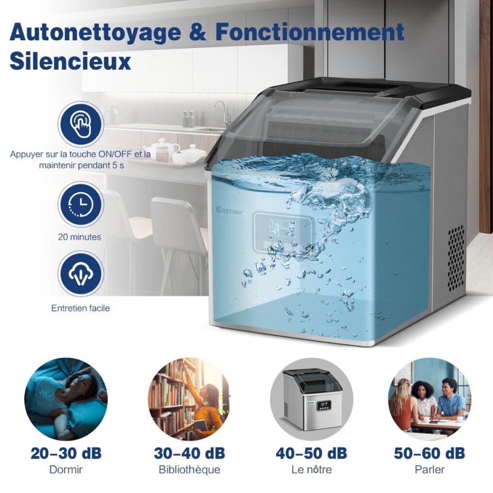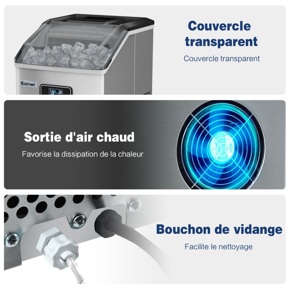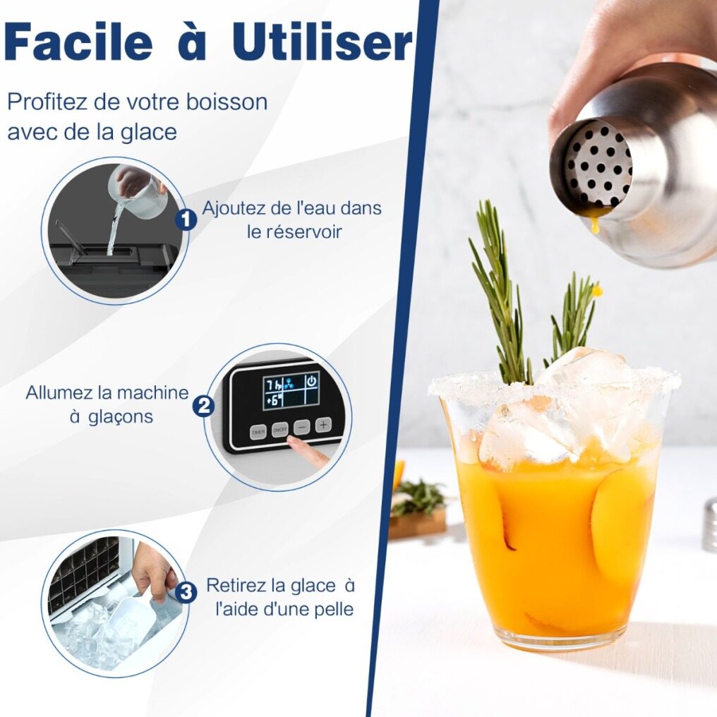 Fast and efficient ice making : The electric ice maker has a high-quality compressor to ensure efficient ice production and lower power consumption. With the production of 24 crystal clear ice cubes per operating cycle and a capacity of up to 22 kg in 24 hours, the ice maker delivers square ice cubes with high hardness. In addition, the machine runs silently, which will not disturb you and your family.