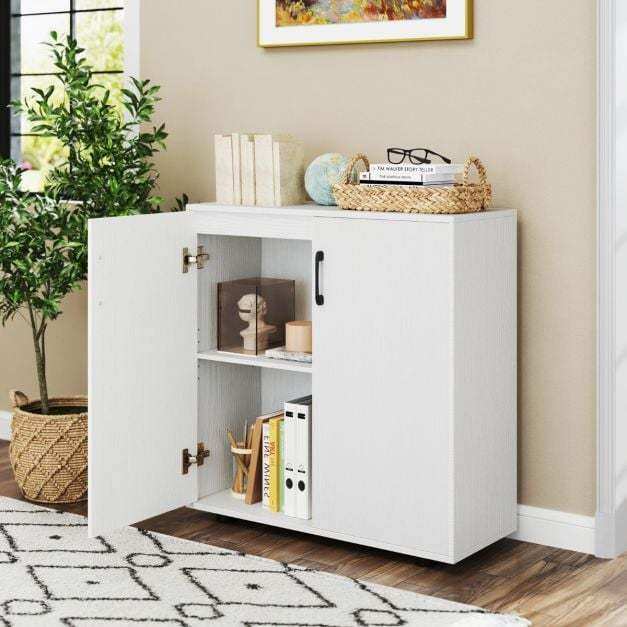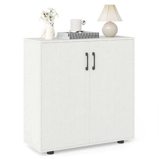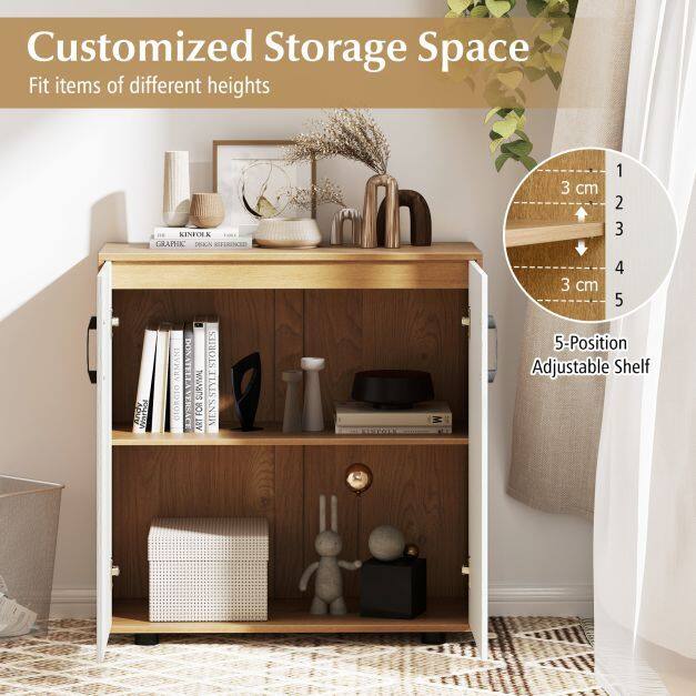 Tailor Your Storage to Perfection: The 2-door cabinet features a 5-position adjustable shelf for customized storage space. Easily adjust the shelf height or remove it altogether, creating the perfect storage solution for items of all shapes and sizes.