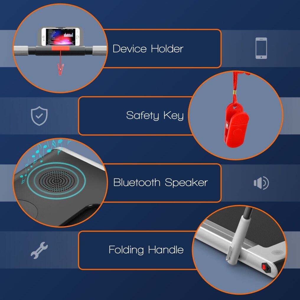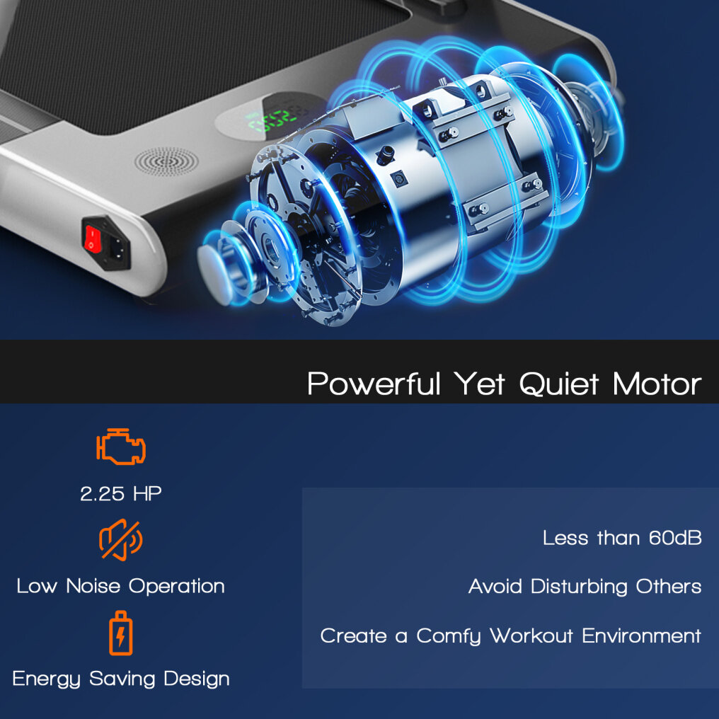 2 in 1 Running & Walking Treadmill:It has 2 sport modes that can be used as a running treadmill and a under desk walking treadmill. Powerful 2.25HP Quiet Motor:Shock Absorption, Low Noise, Energy Saving, Installation-free. Bluetooth Speaker:You can connect this treadmill to your phone through the builtin Bluetooth, so you can enjoy music and movies while exercising. Foldable Design Saves Space.