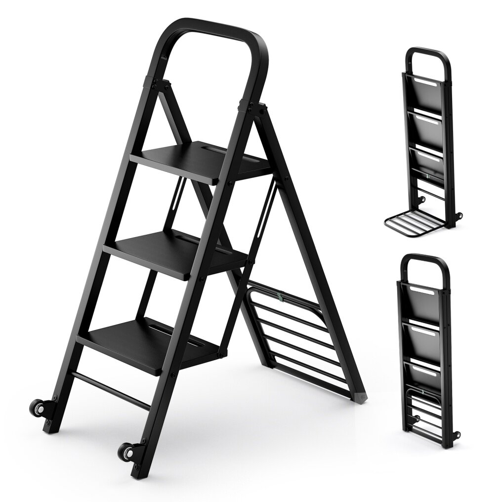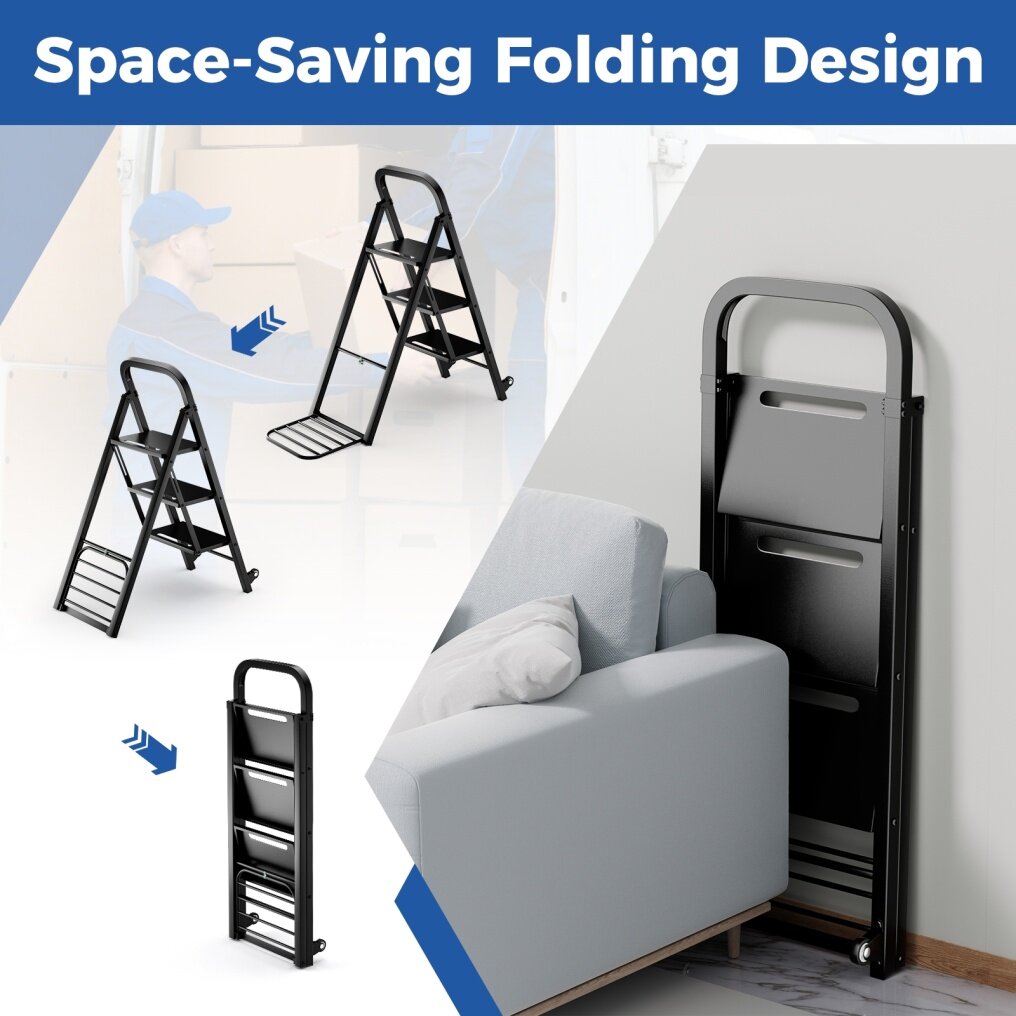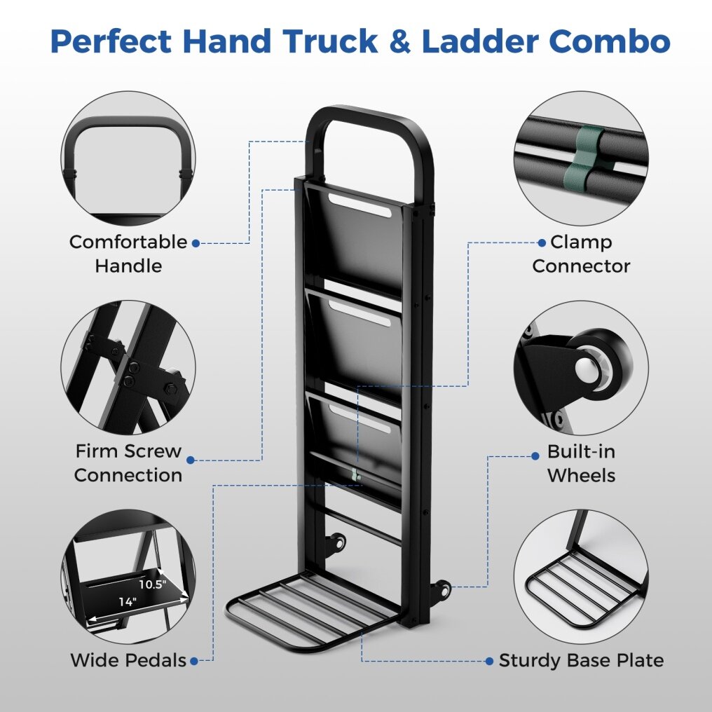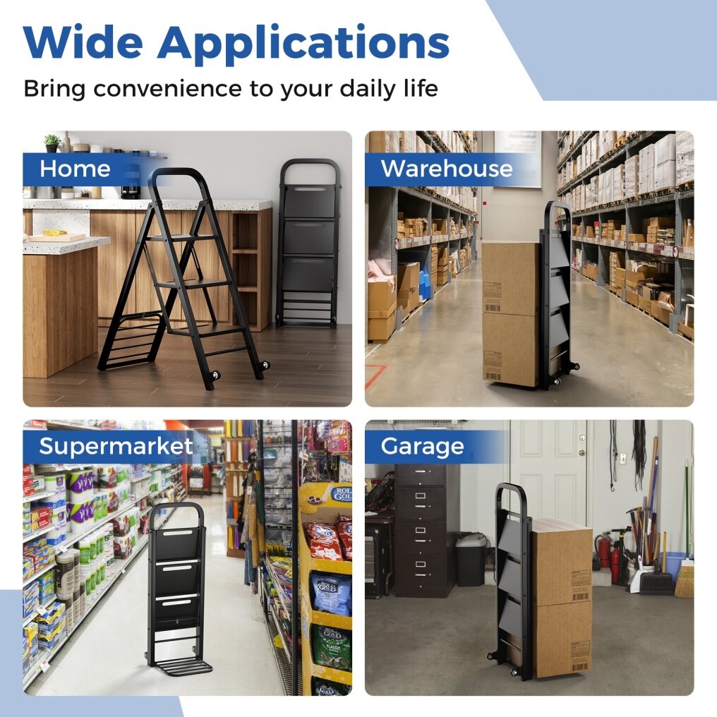 ● 2-In-1 Hand Truck and Step Ladder: Embrace efficiency with this 3-step ladder dolly that maximizes space and functionality by seamlessly switching between a hand truck and a step ladder for all your tasks. Whether you're handling heavy lifting projects or reaching high places, this versatile cart will be your great assistant.