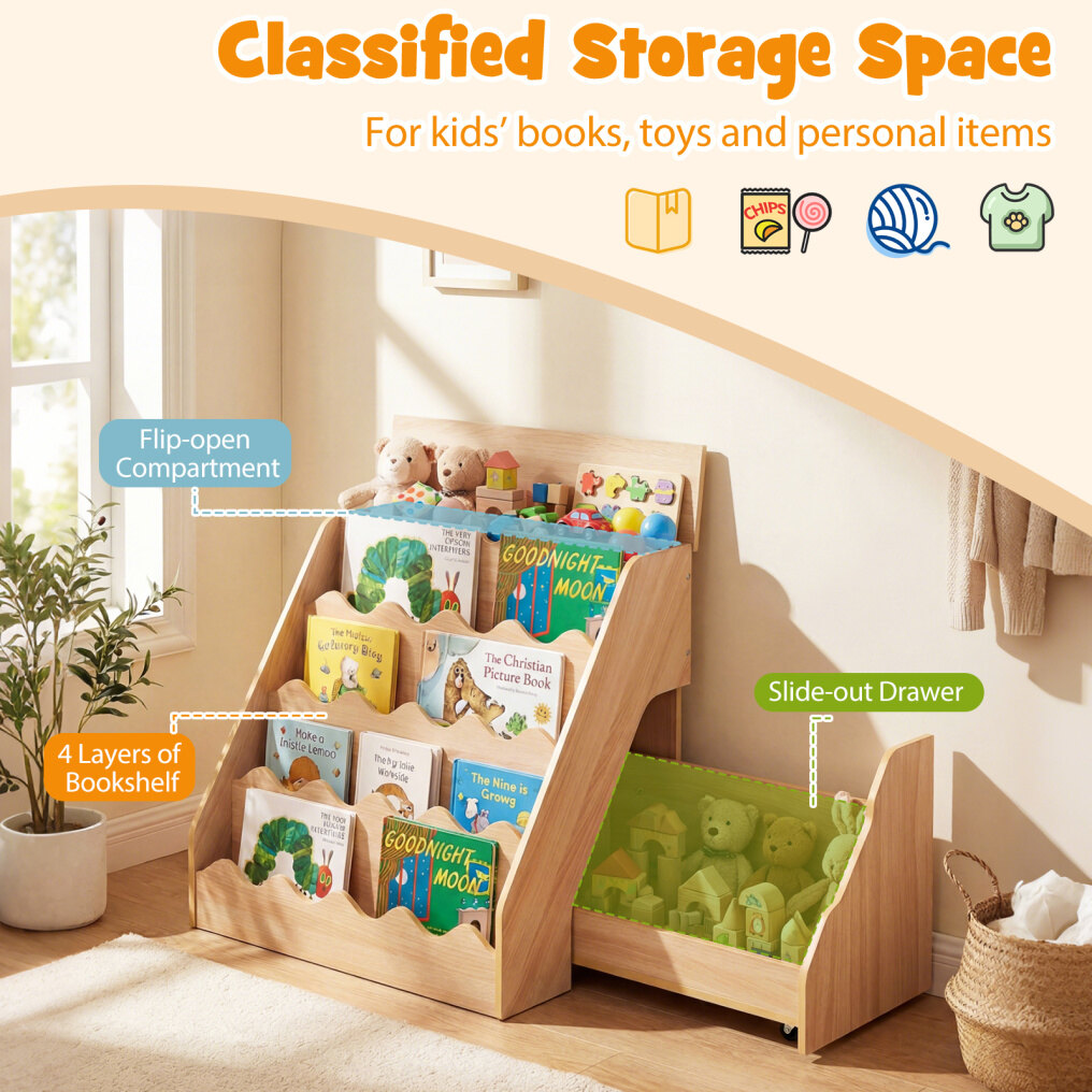 • Classified Storage Space: This multi-functional bookshelf for kids features 4 layers of bookshelf, a secret slide-out drawer, and a top flip box. It makes the ultimate hub for sorting kids' books, toys, and personal items all in one organized, eye-catching spot.