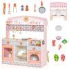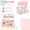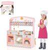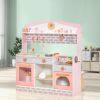 It provides a kitchen and restaurant for children to have different role play experiences. In addition, the realistic facilities and accessories allow children to experience washing foods, cooking, barbecue and so on. The double-sided play kitchen comes with shelves, 3 hooks and other storage places to keep accessories and help children improve their ability of sorting and sorting.