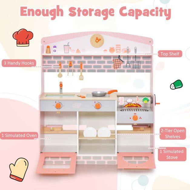 Ample Storage Capacity: The pretend cooking kitchen comes with top shelf, 3 handy hooks, 2-tier open shelf, simulated stove and simulated oven to store accessories and keep space clutter-free. And it can help kids organize and sort items.
