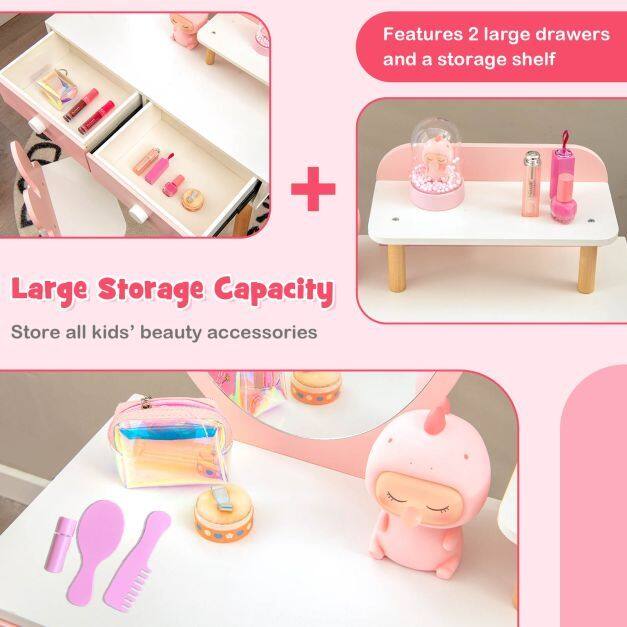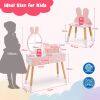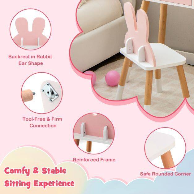 Perfect Gift for Your Little One: Featuring a lovely rabbit appearance, this kid-sized vanity table and chair set will be a wonderful birthday or Christmas gift for your kids. The chair with a wide seat and ergonomic backrest provides great support and comfort for kids while doing makeup, writing or drawing pictures.