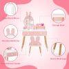 Designed in a cute rabbit shape, this vanity set will be a perfect gift for your little girl, which can make her princess dream come true. The shatterproof acrylic mirror makes it convenient for kids to dress up while ensuring higher security. Besides, this dressing table can also be used as a writing desk. The spacious tabletop offers a roomy dressing or studying area for your kids. Moreover, 2pull-out drawers and the small storage shelf can store their beloved jewelry, cosmetics, brushes, etc to keep the desktop neat and tidy. Made of premium MDF and supported by solid wood legs, the pretend play vanity set is super durable and stable. And the smooth edges without burrs ensure higher safety.