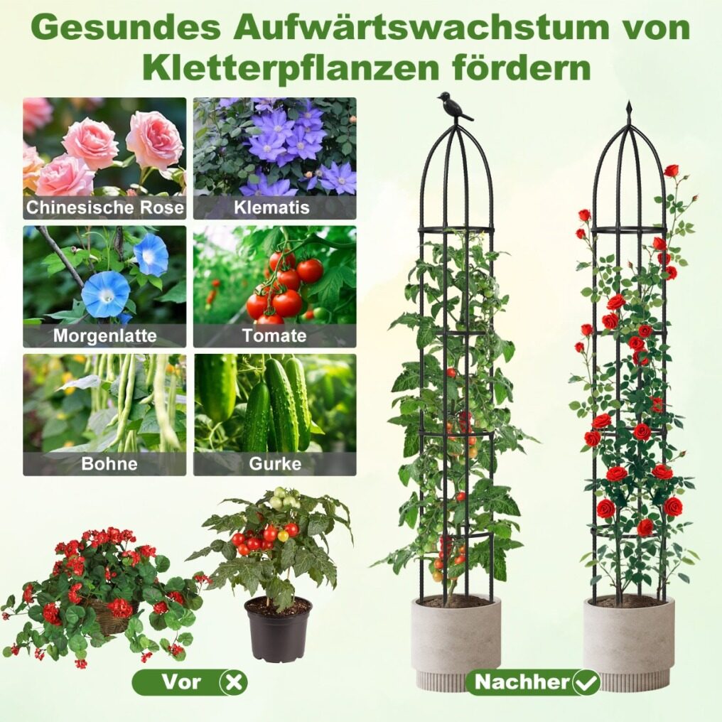 Suitable for Various Climbing Plants: From tomatoes, cucumbers, and beans to Chinese roses, clematis, morning glories, and more, these obelisk trellises cater to a wide array of climbing plants. They provide the perfect structure to help your garden vegetables and fruits thrive, enhancing both plant health and yield.