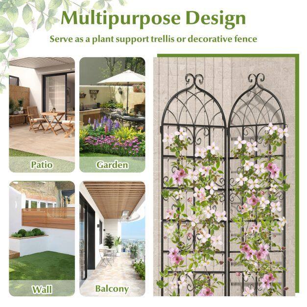 ● Versatile Plant Support: Engineered to support a diverse range of climbing plants, from roses and clematis to cucumbers, beans, tomatoes, and grapes. Whether used in the soil, paired with planters, or placed against a wall, this trellis serves as a robust backbone for both flowering vines and vegetable crops.