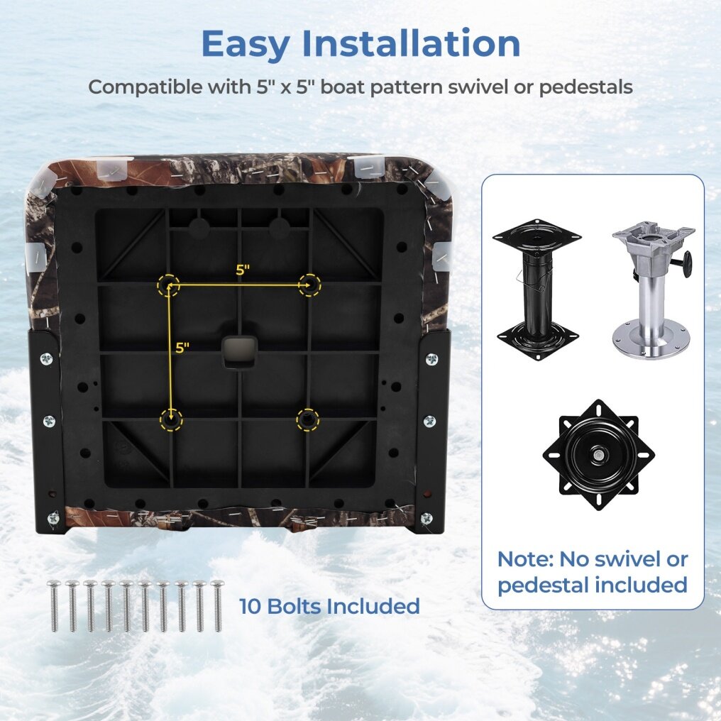 ● Easy Installation: Each set includes 2 boat seats and 10 fixing bolts, with only 4 bolts required per seat for installation. These seats are compatible with 5" x 5" boat pattern swivels or pedestals, enabling a fast and straightforward connection to most boat bases. (Note: No swivel or pedestal included.)