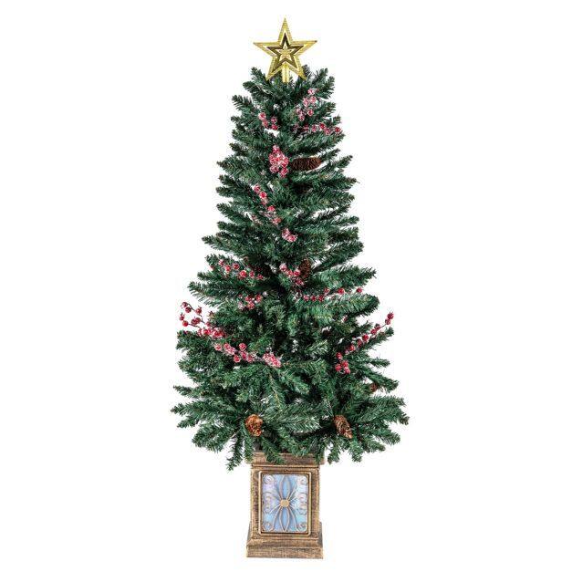 The 4 pieces Christmas tree set is designed for flexible placement throughout your home. The collection features a lush Christmas tree, garland, and matching wreath, making it easy to create a coordinated holiday look. With its convenient hook, the garland can be hung swiftly, perfect for doorways, stair rails, or fireplaces, helping you create a welcoming seasonal display in any room. Frosted red berries and natural pine cones bring winter magic indoors, while a charming treetop star draws the eye and completes your holiday centerpiece. Each piece is crafted from PVC material, which is flame-retardant for safety. Furthermore, the retro-inspired flowerpot base adds a touch of elegance.