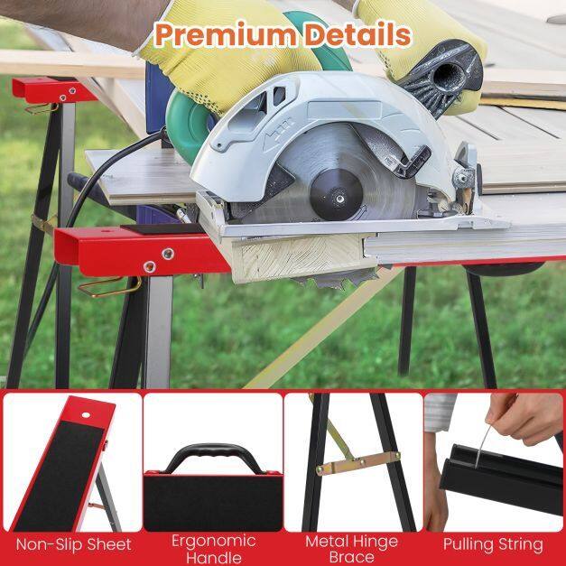 No Assembly Required: These sawhorses are ready to use, requiring no assembly at all. Simply unfold the legs by pulling the cords for instant setup, making them the ideal choice for quick and efficient work.