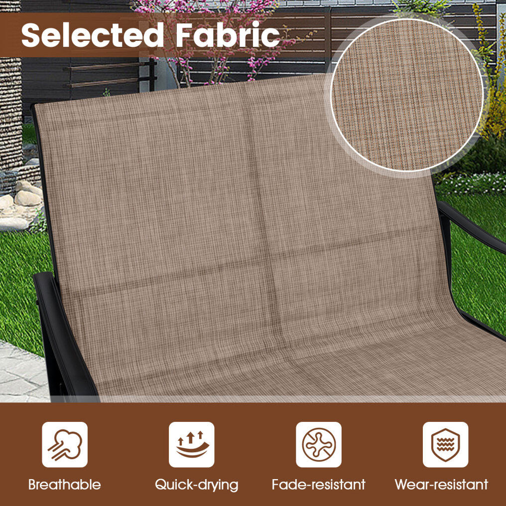 ● Stay Cool and Convenient: The selected fabric of this outdoor glider bench ensures you remain cool on hot days, while being fade-resistant to maintain its durability. Plus, its quick-drying feature makes upkeep a breeze.