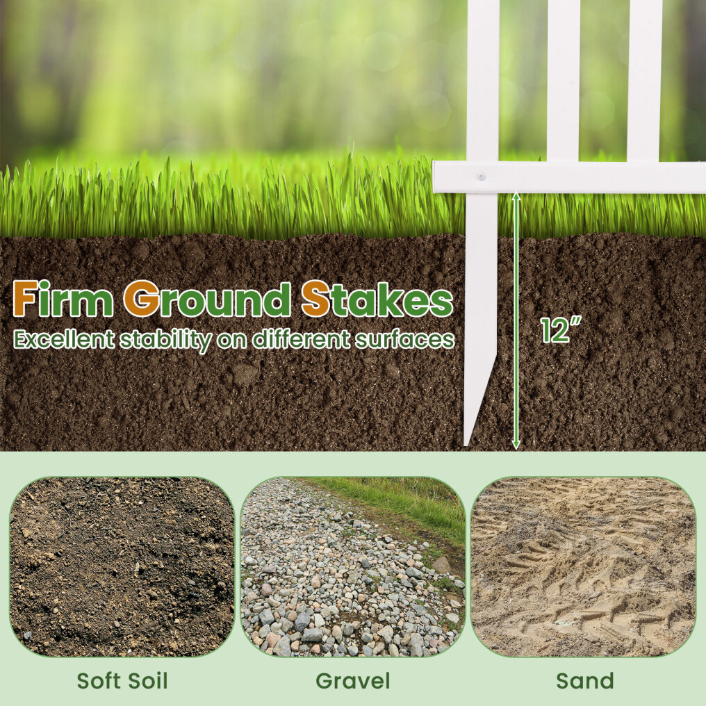 ● Dig-Free Installation: Discover the joy of easy, no-dig setup with the garden fencing. Simply position and insert the sturdy ground stakes for securing. The picket fence is suitable for soft ground and the recommended depth for inserting the stakes is 12".