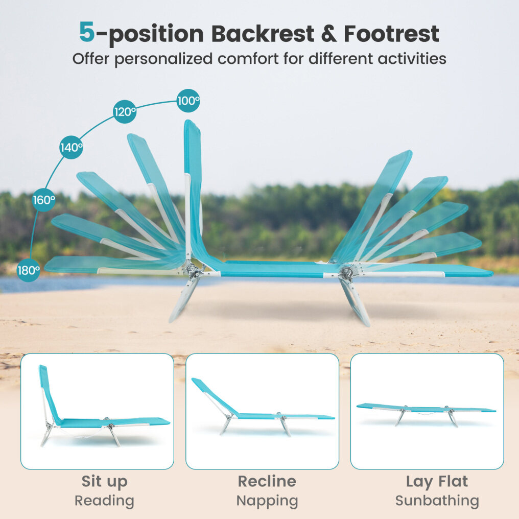 The 5-position adjustable backrest allows you to customize the trio-fold beach chair to sit up, lay flat or recline position. With innovative ratchets, you can simply find the perfect angle and lock it in place without any hassle. Whether you're reading a book or soaking up the sun, this chair ensures optimal comfort for every moment. Crafted from high-quality 600D oxford fabric, the outdoor reclining chair is not only breathable but also tear-resistant, ensuring long-lasting performance even in rugged outdoor environments. The robust metal frame is powder-coated for stability and sturdiness.
