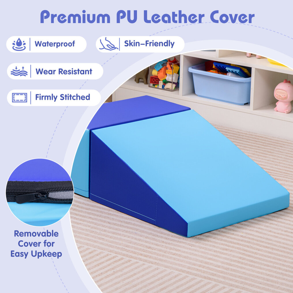 Made of high-density EPE foam filling, this soft play set offers a cushioned and secure surface for play. The step and slide climbers not only promote physical activity but also enhance gross motor skills and sensory development, aiding in balance, coordination, and strength. The PU leather cover is easy to clean and maintain for your child's playtime. The hook and loop fasteners create a strong connection between the foam blocks, allowing for various play configurations such as climbing, sliding, and crawling.